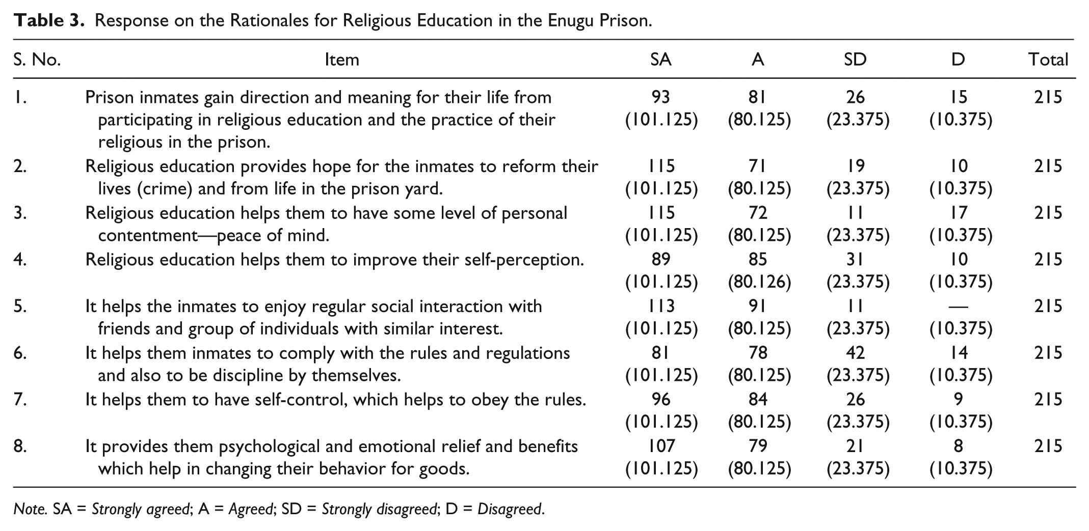 Structured questionnaire was constructed to answer the four research questions, which guided the study. The questionnaire with items on utilization of religious education program in the prison was constructed, and responses elicited from respondents were numerically quantified, tabulated, and analyzed using the Likert-type scale. The first sets of questionnaire aimed to answer the first research question are crafted to address issue of how religious education is likely to improve the lives of prisoners and ex-prisoners. The second sets of questionnaire are directed to elicit what the prisoners believe are reasons for religious education. The third questionnaires are digging to understand what prisoners at Enugu about religious programming and uplifting the image of prisoners and ex-prisoners. Finally, the fourth sets of questionnaire are aimed to find out how prisoners at Enugu thought religious education could curtail ex-prisoners’ recidivism.
