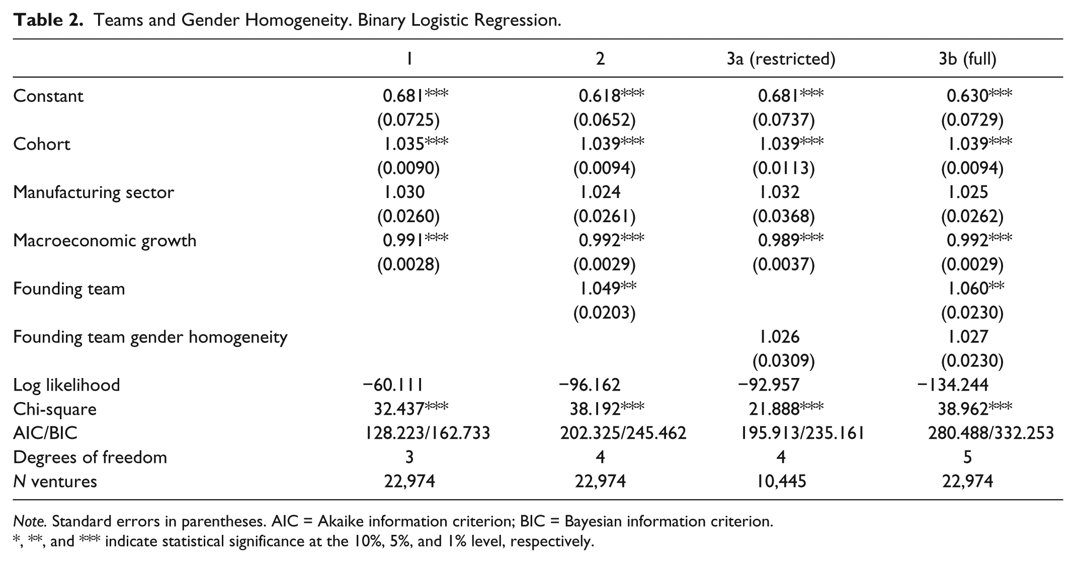 Hypothesis 2 proposed that gender homogeneity increases the likelihood of survival. Model 3 aims at testing this hypothesis, and the model comes in two variants that both introduce the variable for ventures founded by homogeneous teams (either all male or all female). Model 3a is a “restricted” model and only analyzes ventures founded by teams—solo start-ups are here excluded from the analysis. The model shows that it cannot be established that team gender homogeneity per se increased the survival prospects in comparison with teams consisting of both males and females. Similarly, Model 3b, using the entire sample (also including solo start-ups), gives no support for the assumption that founding team homogeneity increases the survival performance. Even if the odds ratio is greater than 1.0, it is not significant in either variant of Model 3. Therefore, the second hypothesis (H2) receives no support.