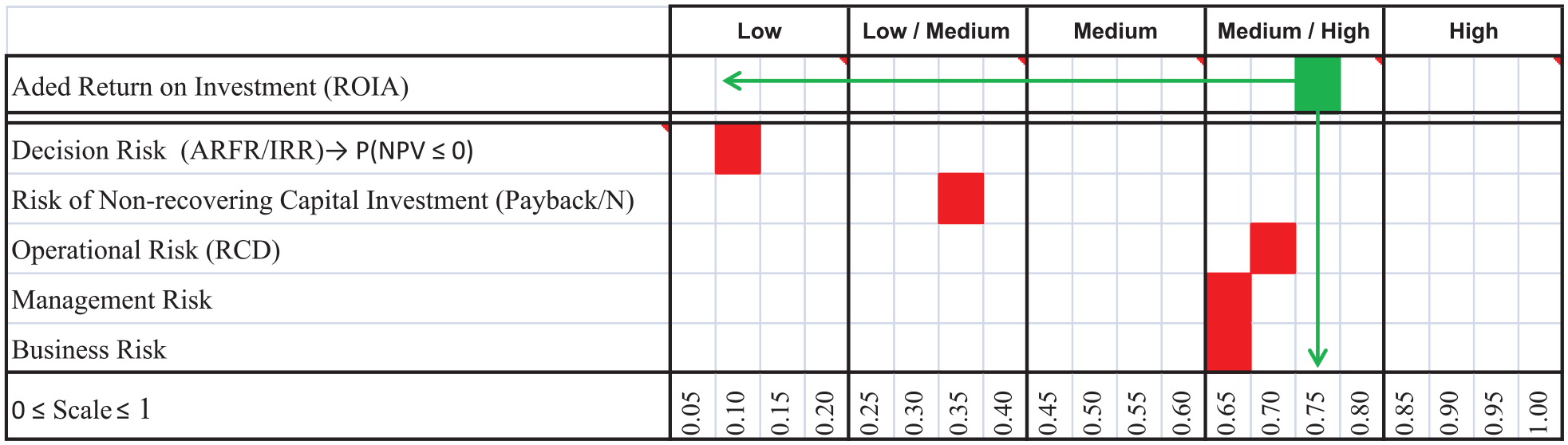 The advantages of using the multi-index methodology to generate indicators of risk and return and the use of the perceptual map to compare the expectations of return with the perceived risks are highlighted by Torrico et al. (2016) and Rêgo et al. (2015). This methodology makes use of two distinct groups of indicators for evaluating the expectations of return and risk perception. The first group is represented by the net present value (NPV), yearly NPV, benefit–cost index, and additional return that resulted from the investment (ROIA). The second group seeks to represent, on a scale of 0 to 1, the perception of the risks inherent to the project and is composed of the MARR/internal rate of return (IRR) index as a proxy of P(NPV ≤ 0), payback/N index as a proxy of the risk of nonrecovery of the invested capital, and degree of commitment of the income to represent operational risk, management risk, and business risk.