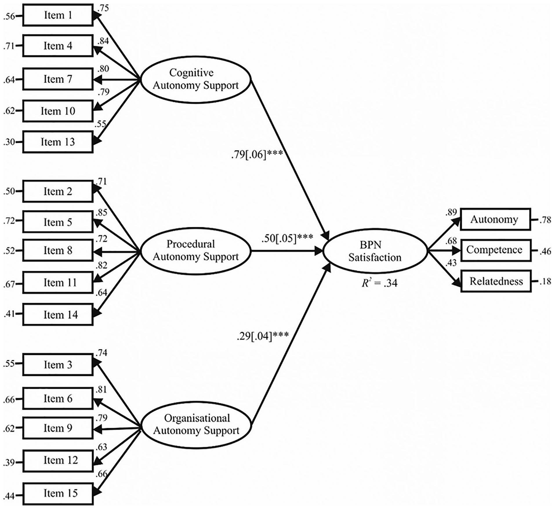 The analysis of internal consistency showed adequate values in terms of Cronbach’s alpha, Raykov’s composite reliability, and AVE for cognitive autonomy support (α = .86, 95% CI = [.84, .88]; ρ = .87, 95% CI = [.83, .90]; AVE = .57), procedural autonomy support (α = .87, 95% CI = [.85, .89]; ρ = .87, 95% CI = [.80, .88]; AVE = .57), and organizational autonomy support (α = .85, 95% CI = [.83, .87]; ρ = .85, 95% CI = [.77, .86]; AVE = .53).