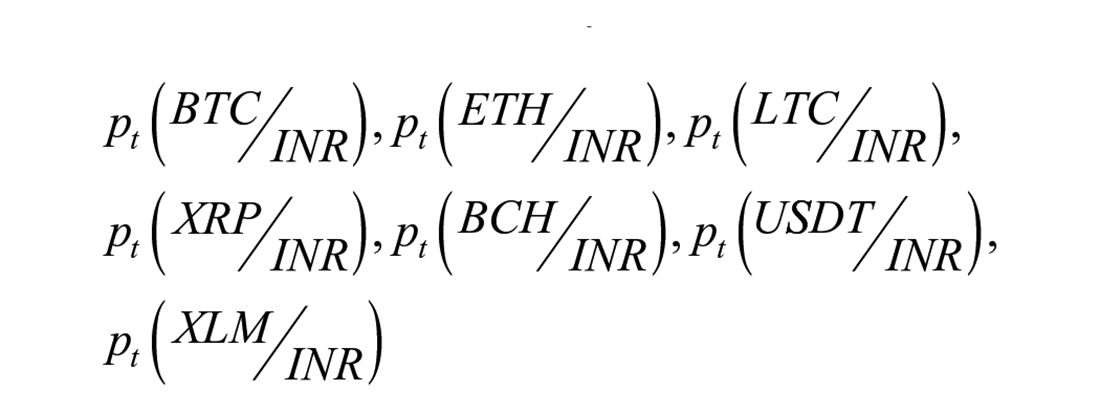 The 486-day rolling window of prices of selected cryptocurrencies denominated in USD, RUB, INR and CNY.