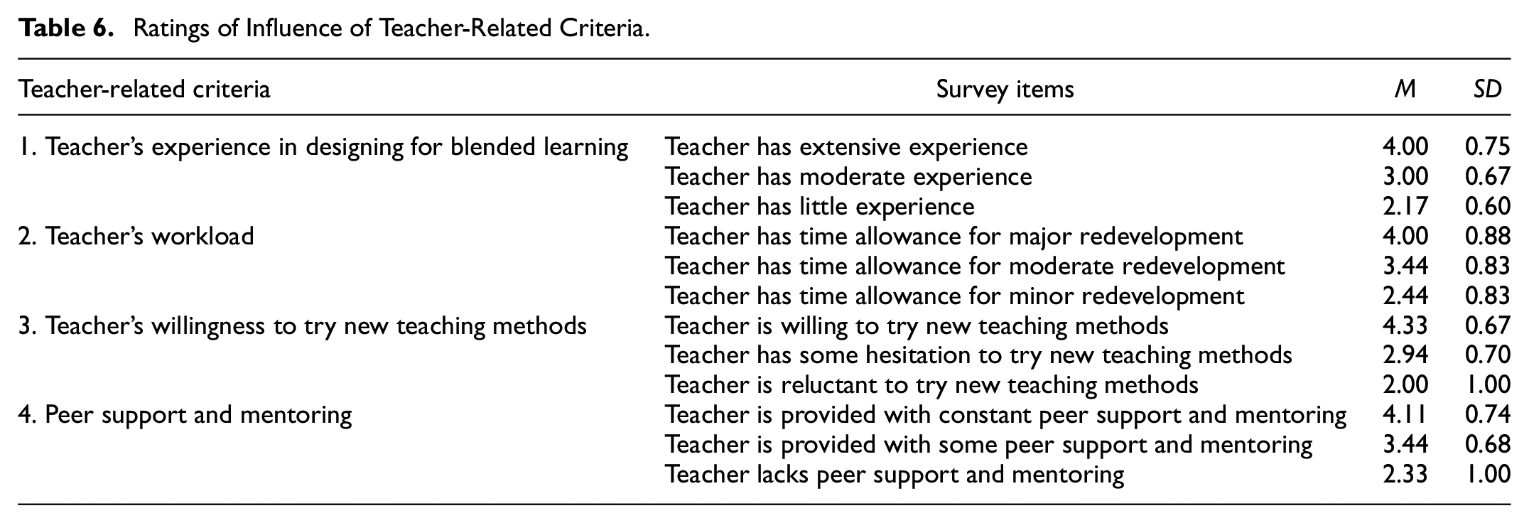 As can be seen in Table 6, all items in this category achieved consensus. The highest mean of online proportion was given to courses taught by teachers who are willing to try new teaching methods (4.33). Teachers’ willingness to try new teaching methods (criterion 3) recorded the highest impact on the proportion of online components compared with the other teacher-related criteria. The experts indicated a high proportion of online components (