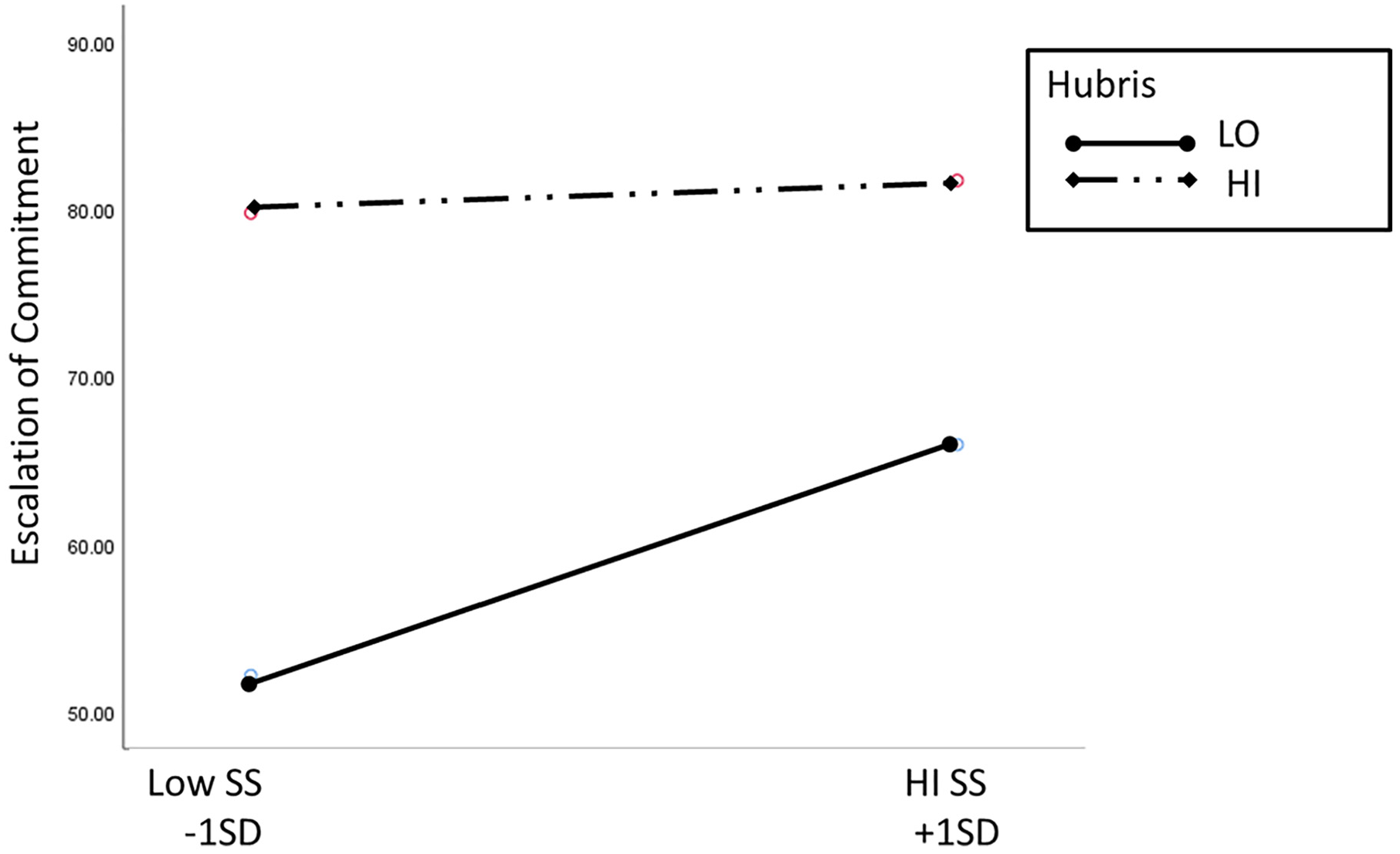 Explicitly, individuals with low hubris levels who have high levels of SS show higher EoC while those with low levels of SS show lower levels of EoC. As shown in Figure 3, for individuals with high levels of hubris, EoC was high regardless of SS levels, that is, EoC was similar for both high and low SS levels (no significant difference).