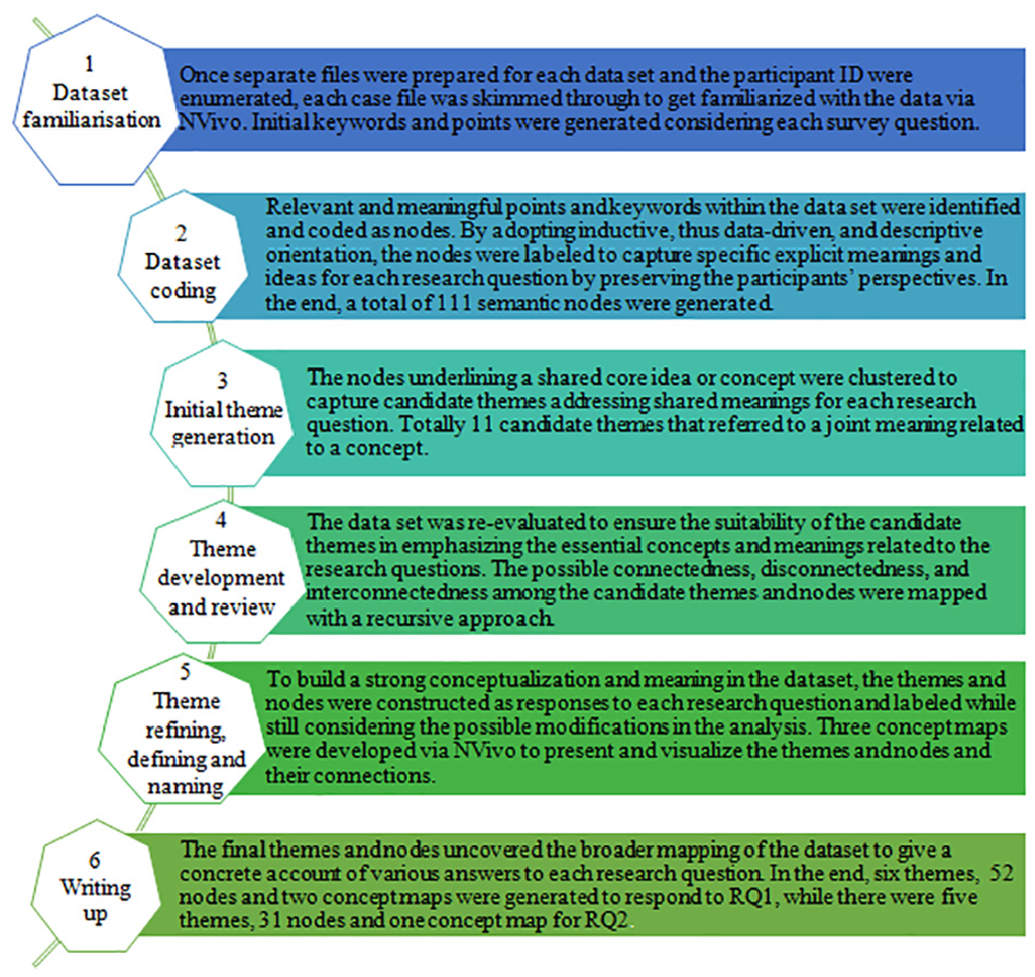 For the analysis of the participants’ responses to the survey, the software NVivo 11 Plus was utilized to generate themes and nodes with the reflexive thematic analysis (TA) due to the flexibility it offers for the researcher who “needs to be active, engaged and thoughtful about the approach they take” (Braun & Clarke, 2022, p. 9). The present study was: (1) inductive due to data-driven codes, nodes, and theme development, (2) semantic due to investigating the more surface and explicit meaning in the participants’ expressions, (3) experiential to capture and explore the participants’ own perspectives and understanding, and (4) realist, which is essential to preserve the reality within the data set (Braun & Clarke, 2022). Despite the potential of subjectivity in TA, in the present study the reflexive TA followed the nonlinear six phases proposed by Braun and Clarke (2022), as seen in Figure 1, in order to enhance transparency in data analysis (Braun & Clarke, 2019).