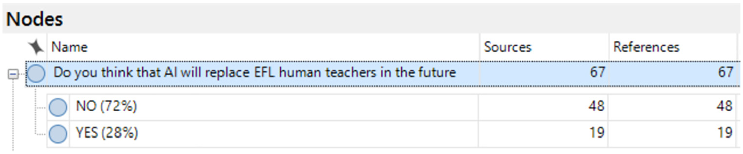 In Figure 6, the findings regarding the prospective EFL teachers’ perspectives on the effects of AI on EFL learning and teaching in the future were categorized under 5 main themes and 31 nodes.