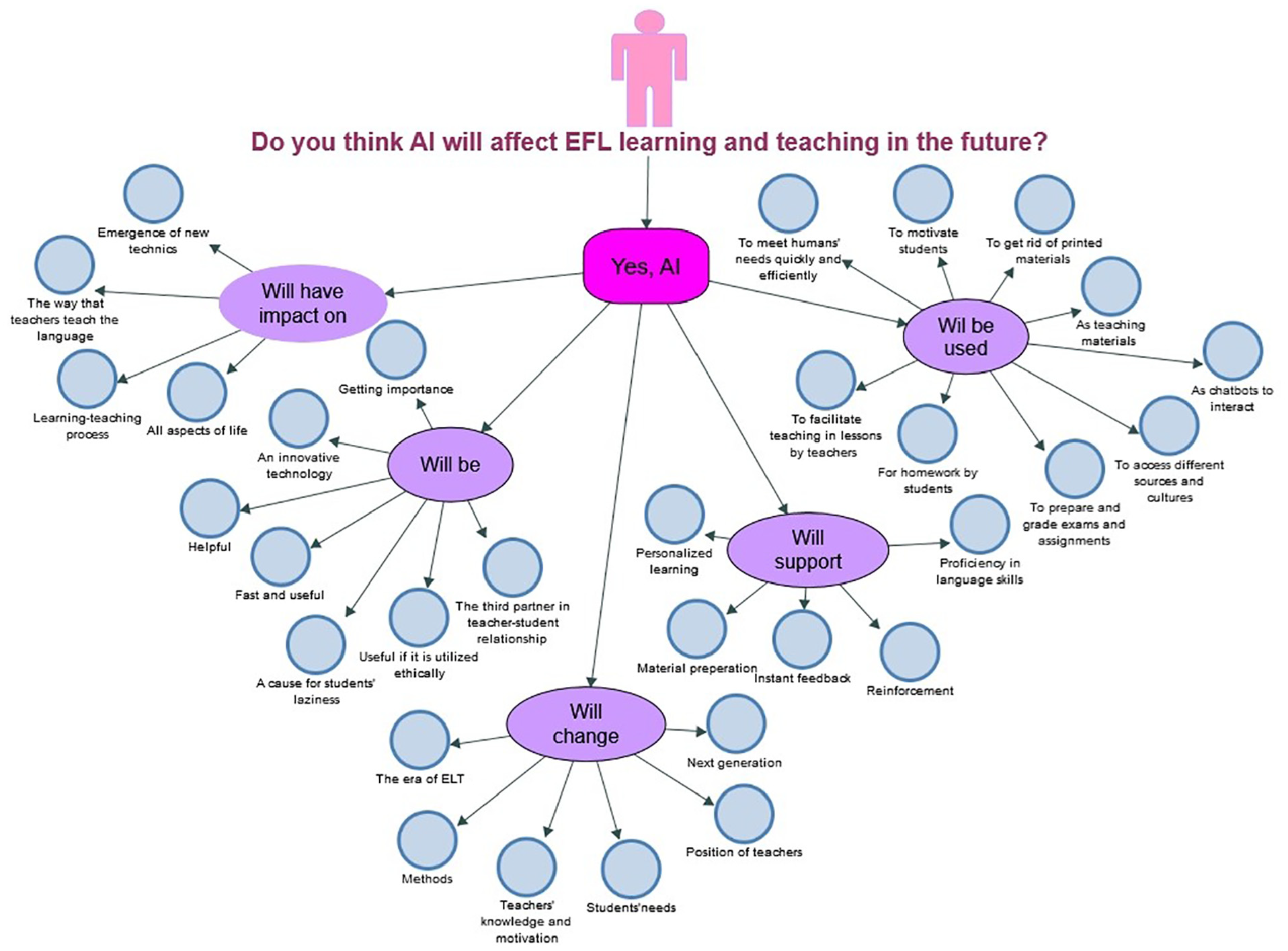 Concept map regarding envisions of the participants (YES) on the effects of AI on EFL learning and teaching in the future.