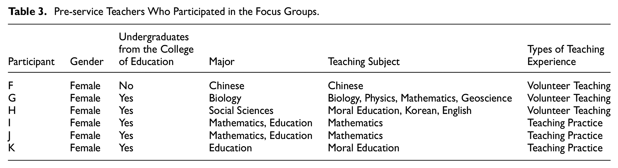 The standard for selecting in-service teachers as research participants were (1) teachers who became public school teachers by passing the national teacher certification tests or private school teachers who passed private schools’ own tests at a similar level to the national one, (2) conducted online classes, and (3) had more than 1 year of teaching experience. We selected three novice teachers with less than 5 years of teaching experience (OECD, 2019) and two experienced teachers with more than 5 years of experience. The standards for selecting pre-service teachers as research participants were college students wanting to become teachers and experienced teaching practice or educational volunteering. Tables 2 and 3 summarize information about the in-service and pre-service teachers participating in the focus groups.