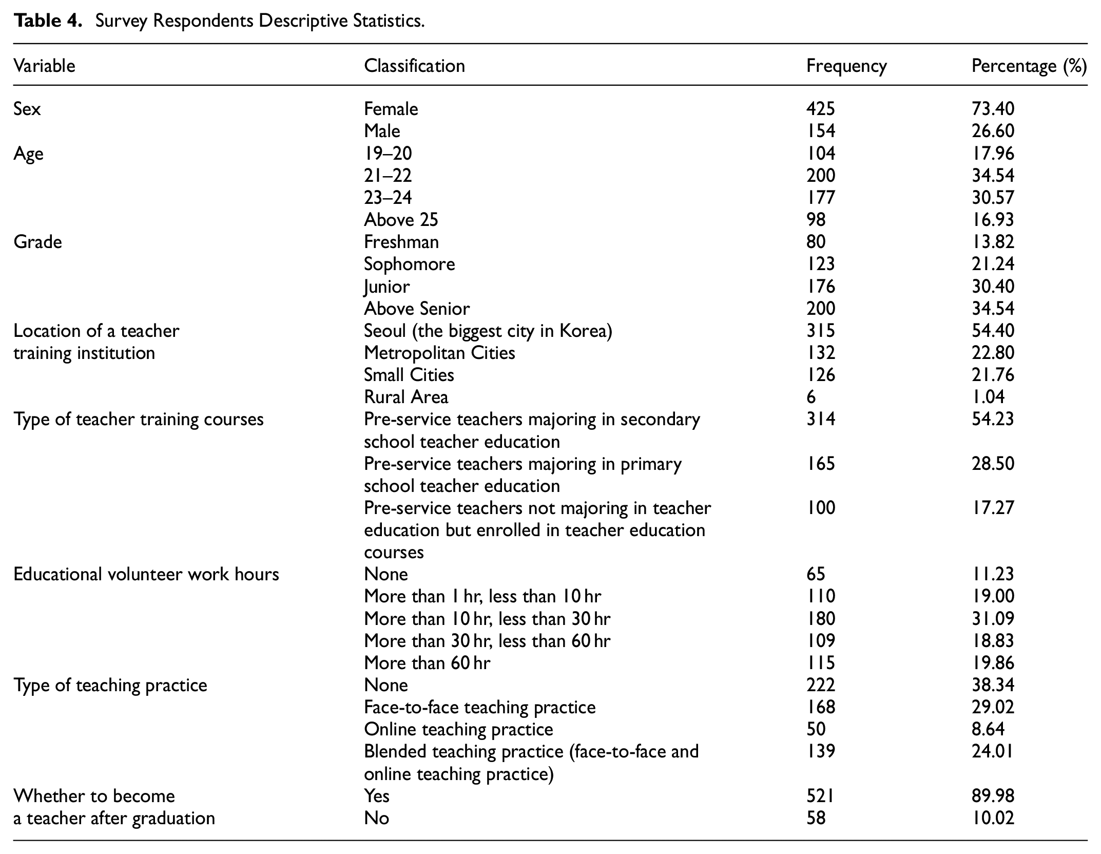 According to the Enforcement Rule of the Teacher Qualification Examination Ordinance by the Ministry of Education of the Republic of Korea, pre-service teachers must complete at least 60 hr of educational volunteer work to obtain teaching qualifications in kindergartens, elementary, secondary, and special schools. So, we asked respondents how much time they had spent on educational volunteer work.