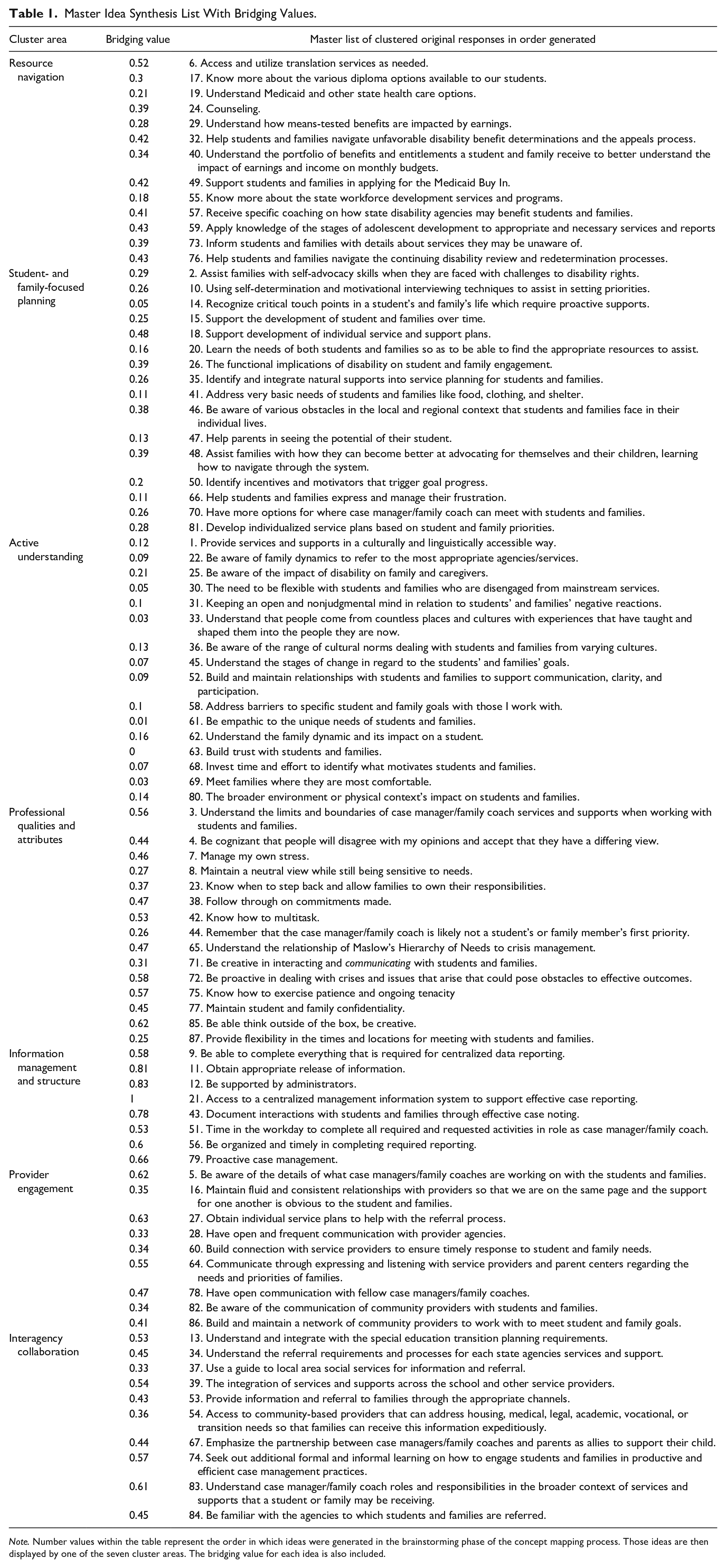 A three-step process was completed to finalize the cluster labels for the concept map. This included (a) software-generated labels based on keyword analysis of individual respondent sorting labels, (b) review and deliberation of computer-generated labels with CSGM® administrators and the study team, and (c) final synthesis of labels with cluster definitions. Table 1 provides a master idea synthesis list, including a detailed list of responses, clustered within broader idea categories, and the bridging value of each idea to the cluster category in the order they were generated by respondents (i.e., Resource Navigation: access and utilize translation services as needed, and counseling). The lower the bridging value or the connection of two ideas on the map, the stronger the relationship between statements within that cluster. Bridging values closer to a value of “1” show greater relationship to a broader number of statements located in clusters across the map and are considered to have a stronger bridging value to other clusters, and are typically located more closely to the center of the map. Taken together, these clusters represent the taxonomy of case management services reported by case managers and family coaches as most essential to supporting the successful postschool outcomes of youth SSI recipients and their families. Table 2 provides a brief definition of each cluster.