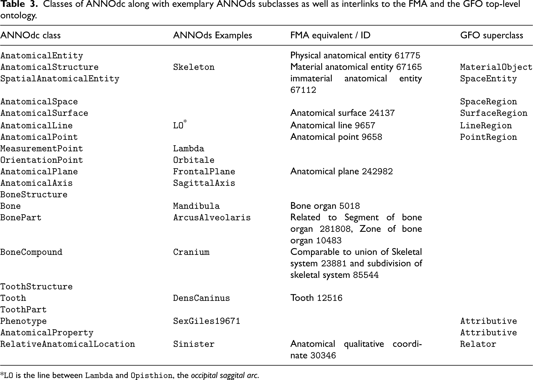 An anatomical entity is either an anatomical (material) structure or a spatial anatomical entity, such as Cranium or FrontalPlane . An anatomical structure refers to any anatomical division or material anatomical entity. ANNO describes three kinds of anatomical structures: tooth structures (teeth and teeth parts), bone structures (single bones, bone parts and bone compounds), as well as the complete skeleton. The GFO defines a material object gfo:MaterialObject as a solid concrete entity that belongs to the material region of the world, has mass, consists of matter and occupies space (Loebe et al., 2021). Accordingly, we define anno:AnatomicalStructure as a gfo:MaterialObject in the anthropological context. The closest equivalent in the FMA is the “Material anatomical entity” fma:67165 , the subclass of “Physical anatomical entity” fma:61775 that has mass.