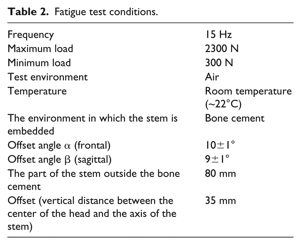 The sinusoidal compressive loads (with 15 Hz frequency and limits between 300 N and 2300 N) were applied to the implants during the test. The vertical displacements of the implants were measured via displacement sensor connected to an actuator in the test machine at every 50,000 load cycles. The detailed test conditions are given in Table 2.