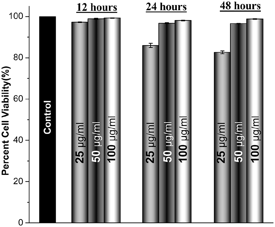 Osteosarcoma cell lines MG63 collected from The School of Life Sciences and Biotechnology (SLSB) of Shanghai Jiao Tong University (SJTU) were cultured in DMEM with antibiotic and antimycotic solutions and fetal bovine serum procured from Servicebio Ltd. China. Test extracts as prepared for Hemolytic studies were used to assess the cytotoxicity levels, wherein different volumes (25, 50, 100 µg/ml) were used to determine the optimized release concentration of the samples based on weight measurements of metal samples in coated and uncoated states. Weight measurements of respective coated samples as bare and coated states were used to determine the volume of media to meet weight/volume concentration of test extracts mentioned above. Cultured cells were washed with PBS and incubated with test extracts for 24 h in a serum-free media at 1 × 104 cells/well with cells treated with sterilized physiological saline serving as medium for test extracts as control and undergoing similar treatments as test extracts throughout. The medium was aspirated after the incubation period and treated with 3-(4,5-dimethylthiazol-2-yl)-2,5-diphenyl tetrazolium bromide (MTT) prepared in PBS and further incubated for 4 h, followed by washing of the cells with PBS. 37 The as-formed crystals that turned purple were dissolved in dimethyl sulfoxide (DMSO), and absorbance was measured at 570 nm. Collected data was put to the following equation, and relative cell viability was measured.