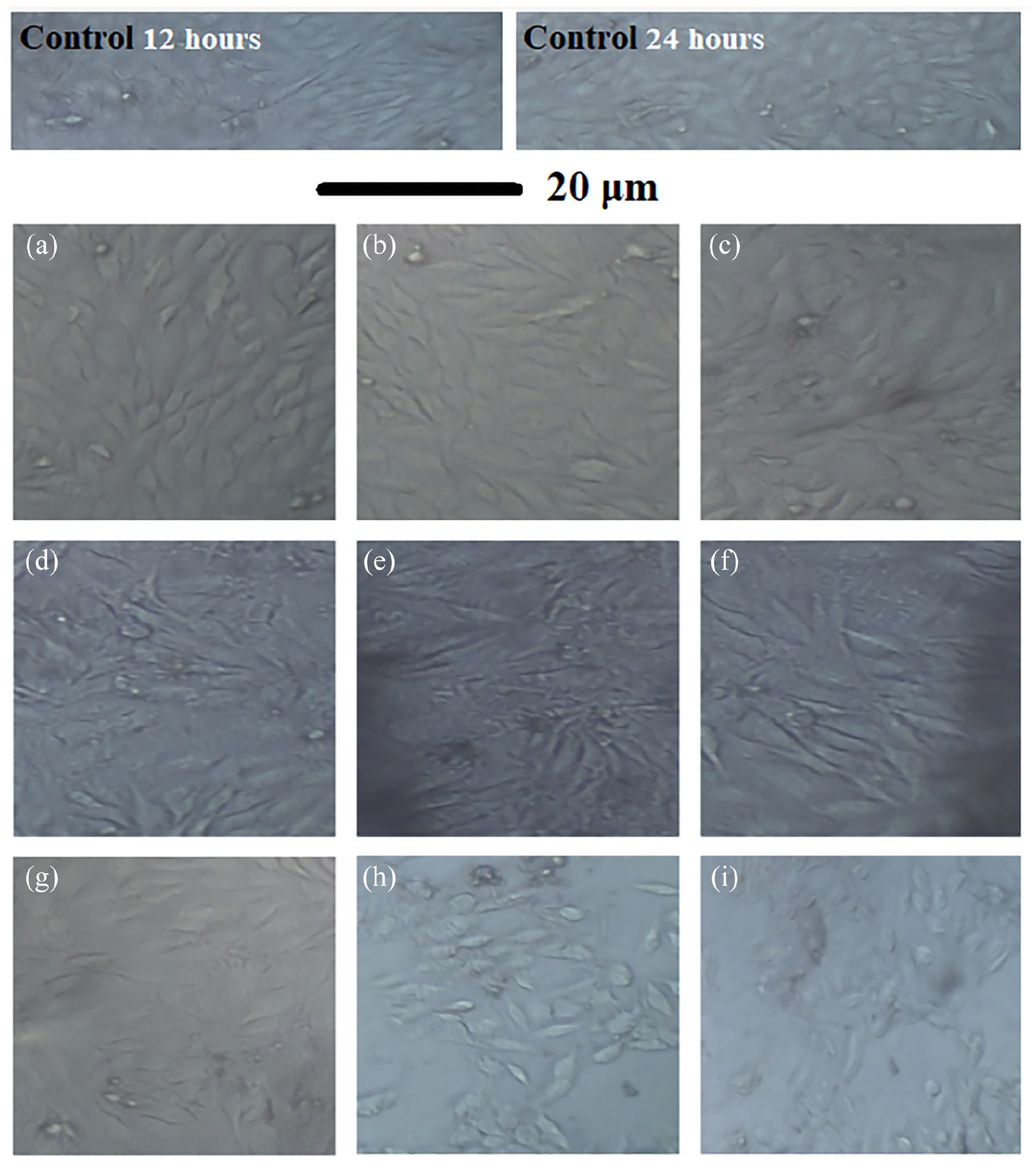 Optical micrographs of MG-63 cell lines after 12 h: (a) 25 µg/ml, (b) 50 µg/ml and (c) 100 µg/ml, 24 h (d) 25 µg/ml, (e) 50 µg/ml, (f) 100 µg/ml) and 48 h (g) 25 µg/ml, (h) 50 µg/ml and (i) 100 µg/ml.
