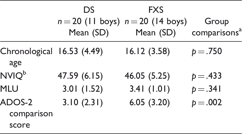 ADOS-2: Autism Diagnostic Observation Schedule – Second Edition; DS: Down syndrome; FXS: fragile X syndrome; MLU: mean length of utterance.