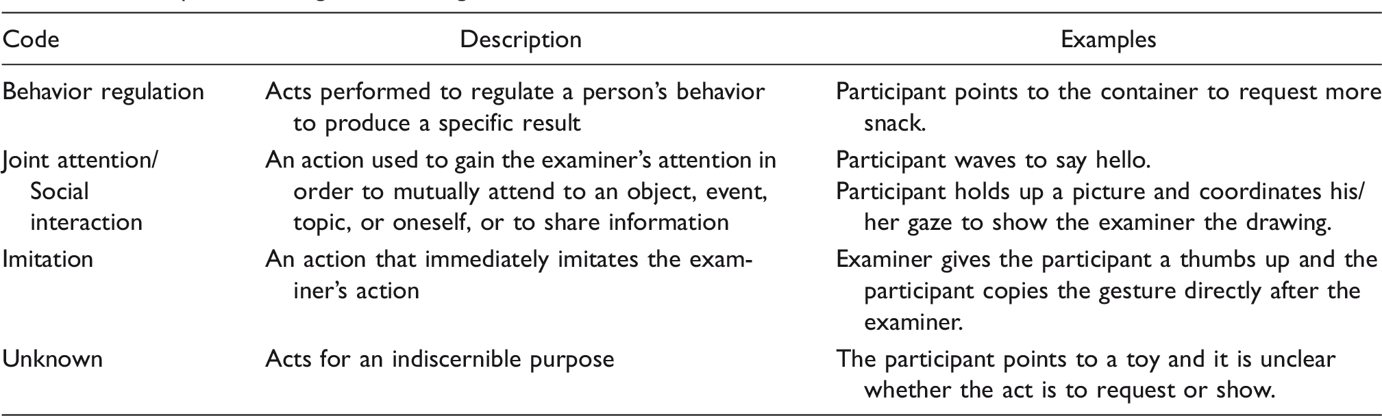 Two student coders independently completed all of the coding. Both coders were blind to participant diagnosis. Prior to coding participant files from the present study, coders reached a training criterion of at least 80% agreement on three different samples for both quantity and quality measures. Once criterion was met, the coders were randomly assigned ADOS-2 administrations to code (i.e., each coder independently completed approximately 50% of the files). Twenty percent of the videos were chosen at random and coded by a second coder independently to determine inter-rater reliability. Reliability was measured by calculating Cohen’s kappas. Cohen’s kappa for the total number of gestures was .91. Gestures coded as behavior regulation and joint attention/social interaction were .87 and .92, respectively. These values indicate near perfect agreement (Hallgren, 2012). Gestures coded as behavior regulation were less frequent, which likely contributed to the kappa value falling below .90. Therefore, two coders consensus coded all instances previously identified as behavior regulation for all 40 participants. During consensus coding, both coders agreed on whether the gesture purpose was behavior regulation or was instead an instance of joint attention/social interaction. After agreement, the proportions of gestures for each purpose were updated.