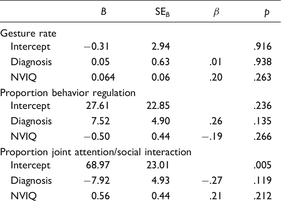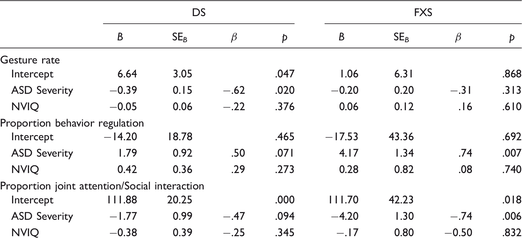 The results of the multiple regression in FXS indicated that ASD symptom severity did not significantly predict gesture rate when controlling for NVIQ,