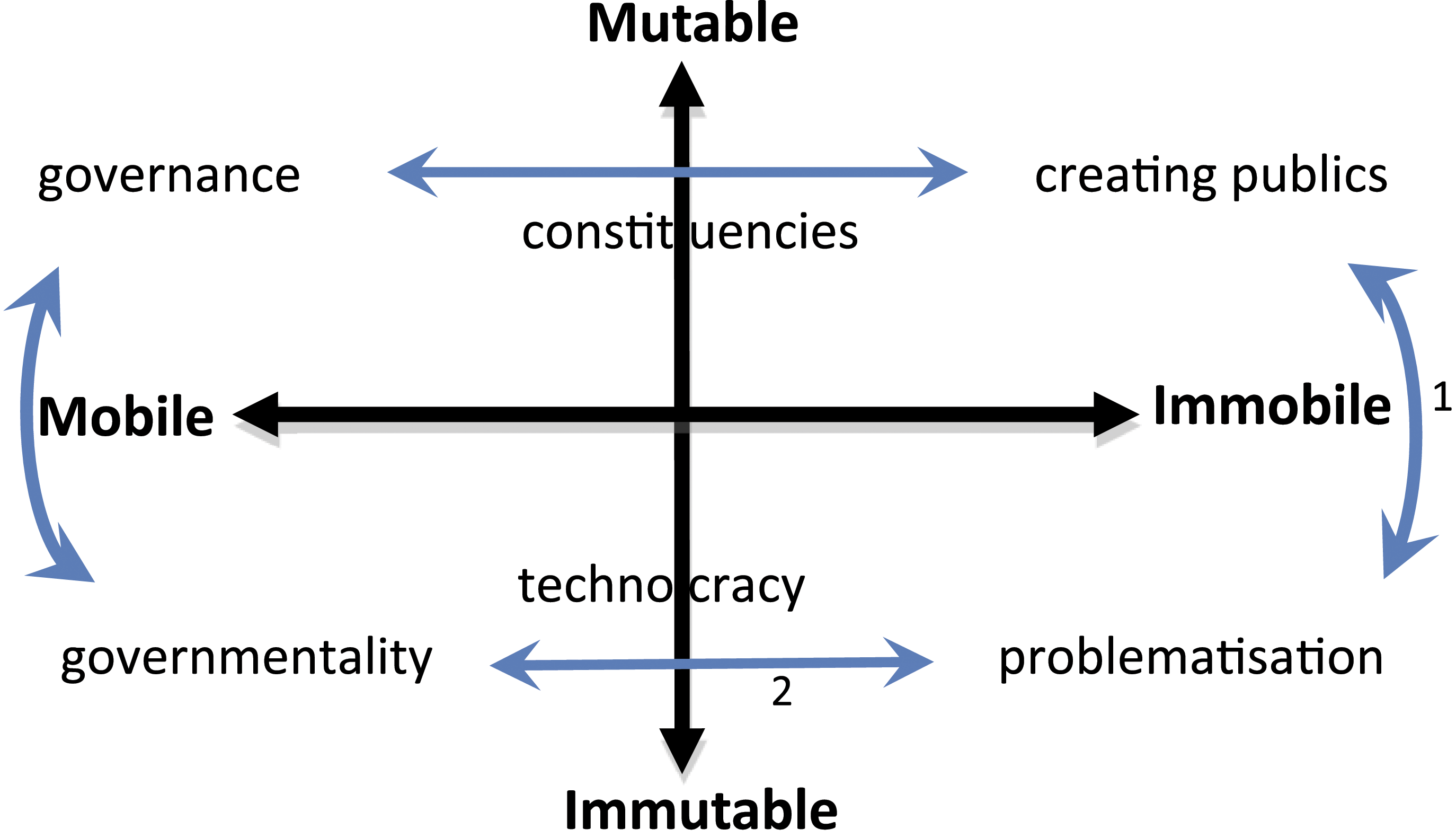 How do we trace and map spatial topologies and their role in issue trajectories? That basically comes down to exploring the connectivities and associations between entities through which issues become and proliferate. Here, we build on ANT’s foundational thinking in terms of (im)mutability and (im)mobility. That thinking is rooted in Latour’s (2005a, 2005b, 2007) seminal work on ‘immutable-mobiles’ in the development of modern, technocratic societies through the proliferation of practices, such as classification, scripting, measuring, filing and tooling. Here, we define (im)mutability and (im)mobility as follows: