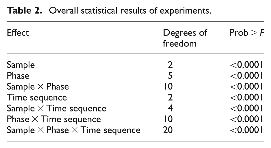 The statistical analysis presented in Table 2 shows the main effects, sample, phase, and time sequence (Basic, Variant 1, Variant 2), demonstrating a significant effect. Additionally, interaction effects were observed between the main effects, which means the AUC values would have different trends depending on the level of main effects. Consequently, there were significant differences between the three cycles for all fabric and fiber types.
