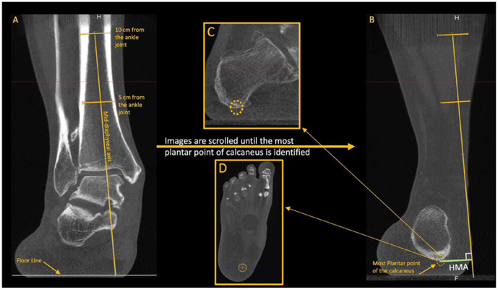 Hindfoot moment arm (HMA). (A) Using the coronal plane, 2 mid-diaphyseal lines are drawn at 5 and 10 cm proximal to the ankle joint to determine the anatomical axis of the tibia. (B) The axis line is then extended inferiorly, crossing the floor line. (B, C, and D) The HMA is determined by the distance between the anatomical tibial line and the most inferior voxel of the calcaneus (confirmed on all planes). 36