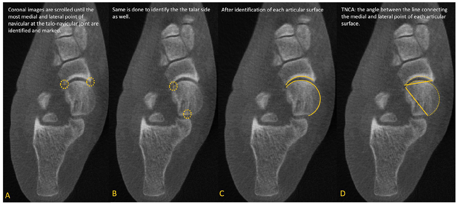 Talonavicular coverage angle (TNCA). On the axial view, (A) Marking medial and lateral edges of the proximal navicular articular surface. (B) Marking medial and lateral edges of the talar head articular surface. (C) Full proximal navicular and talar head articular surfaces highlighted. (D) Talonavicular Coverage Angle marked, with lines connecting medial and lateral edges of the proximal navicular and talar head articular surfaces. 34