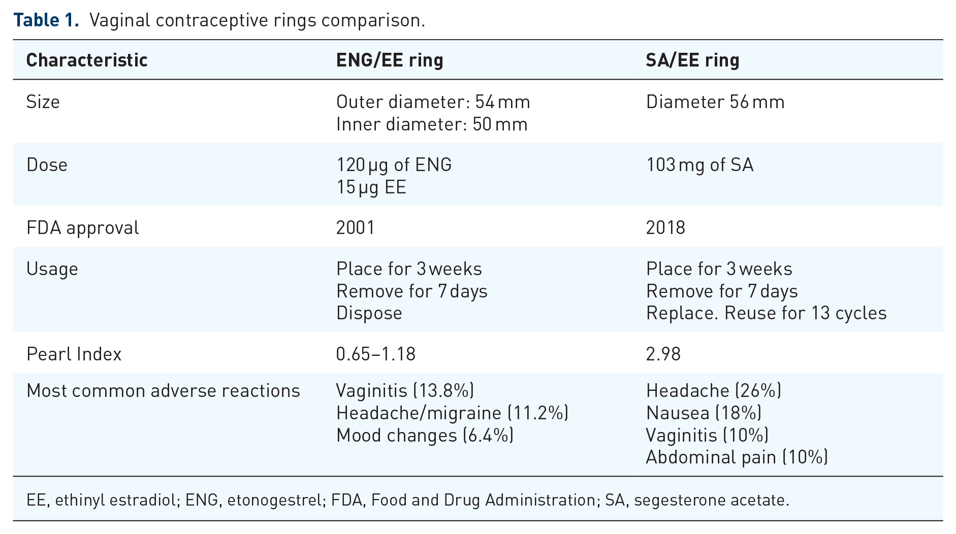 The vaginal contraceptive ring is considered a ‘second-tier’ contraceptive method, meaning that it is considered very effective; however, it is user dependent, which decreases its efficacy. 1 The very first Food and Drug Administration (FDA)-approved vaginal contraceptive ring was released in 2001. Since that time, numerous studies have been performed examining the efficacy of the vaginal contraceptive ring, and different versions have been released. There are limited resources that have synthesized this information into a single document. In this article, we will discuss the different types of vaginal contraceptive rings: the etonogestrel/ethinyl estradiol (ENG/EE) ring and the segesterone acetate (SA)/EE ring. The details of dosing and administration, indications, advantages, disadvantages, usage, adverse reactions, efficacy, cost-effectiveness, and newest research available will be reviewed for each method. The purpose of this article is to provide a comprehensive reference on the two vaginal contraceptive rings widely used in the United States for clinicians to guide management.