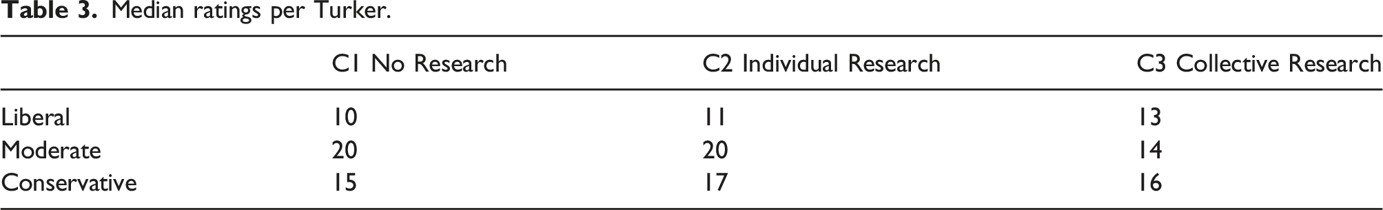 As shown in Table 4, the ICC was 0.422 (CI = [0.388, 0.460]) in the no-research condition, 0.458 (CI = [0.423, 0.496]) in the individual research condition, and 0.510 (CI = [0.473, 0.548]) in the collective research condition. The ICC for C1 falls outside the confidence intervals of the two research conditions. The ICC for C2 falls outside the confidence for C3 but just inside the confidence interval for C1.