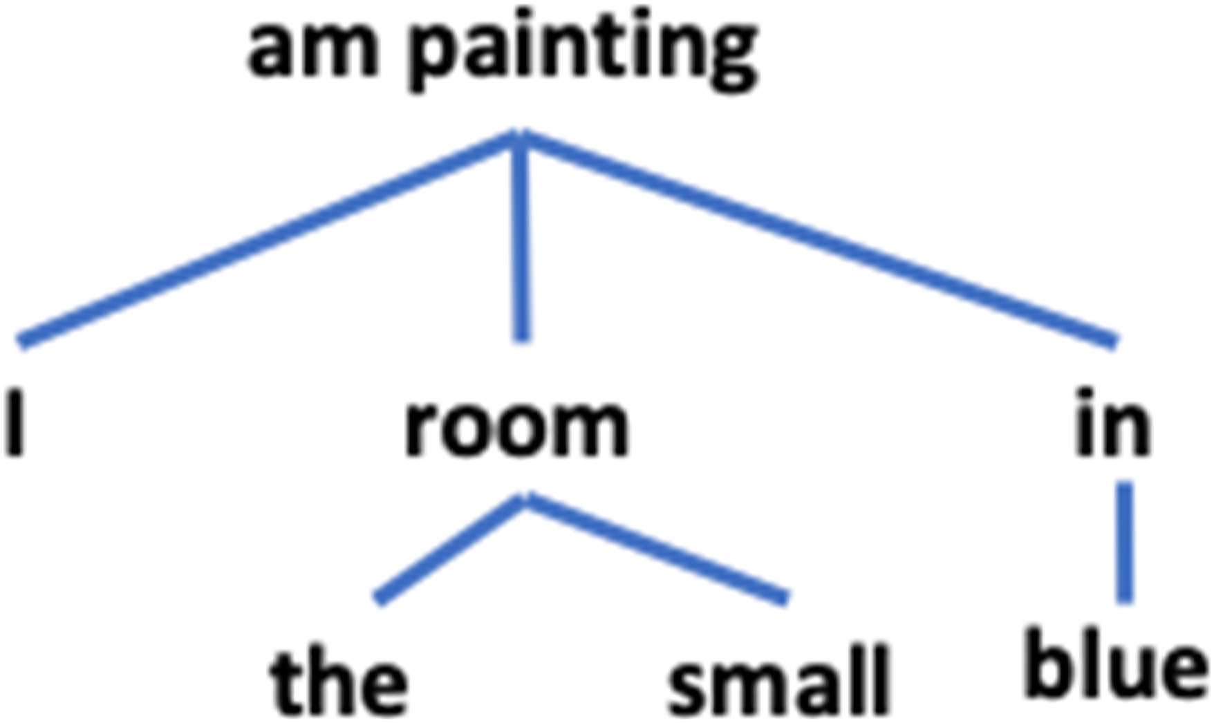 According to Roman Jakobson (Jakobson, 1963) and the structuralist school of linguistics, a language crosses two axes: syntagmatic and paradigmatic. Let’s start by defining a syntagm: it is a sequence of words—a sentence or a phrase—belonging to a language whose grammatical rules allow us to reconstruct the dependency tree and the role of each leaf in this tree. Let's consider the sentence: “I’m repainting the little room in blue.” Figure 1 The syntagmatic axis: a string of sounds is organized in a dependency tree.