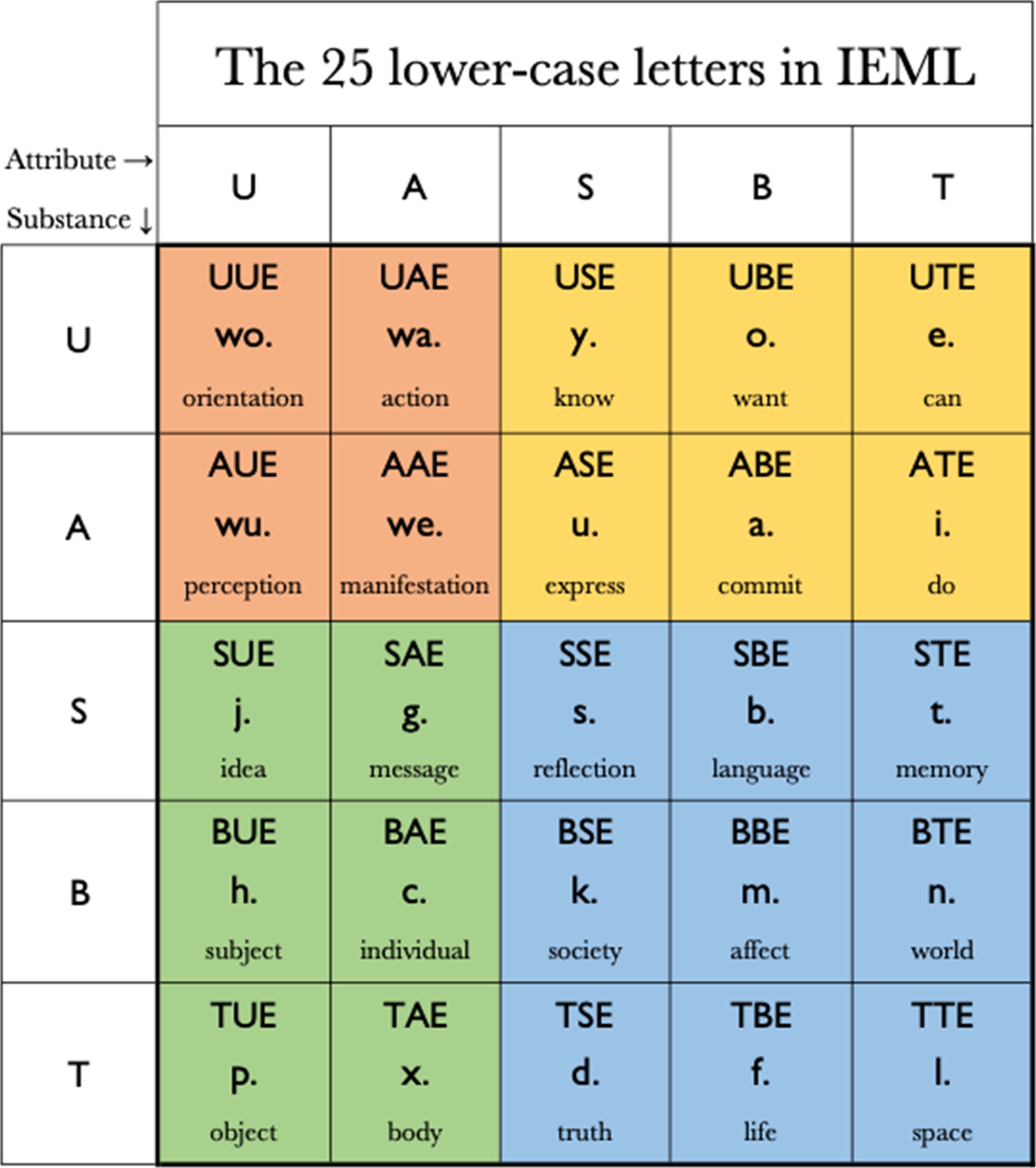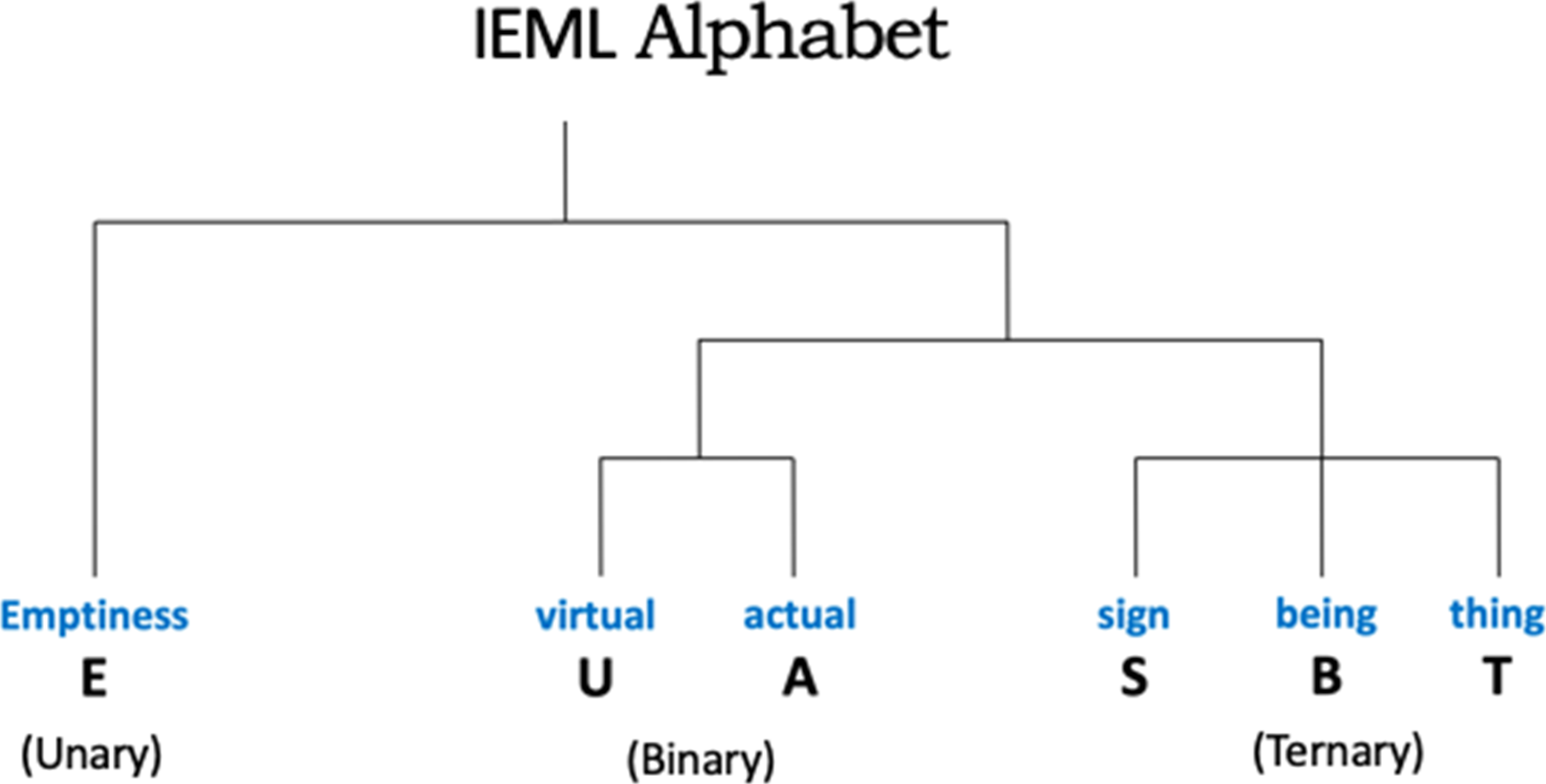 IEML, being a regular language, is based on a set of six primitive symbols, or alphabet: (E U A S B T). All IEML expressions are composed of punctuated sequences of these six characters. Each of the letters is a word in itself and represents a particular meaning when used alone. But when a letter is used in the composition of another word, it serves to mark a paradigmatic invariant or a position in a symmetry group.