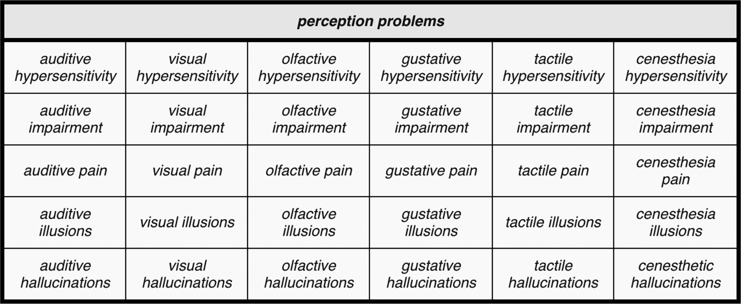 0 #perception problems -, 1 {#hypersensitivity; #disability; #pain; #illusions; #hallucinations}, 2 {#sense of hearing; #sense of sight; #sense of smell; #sense of taste; #sense of touch; #cenesthesia} ).
