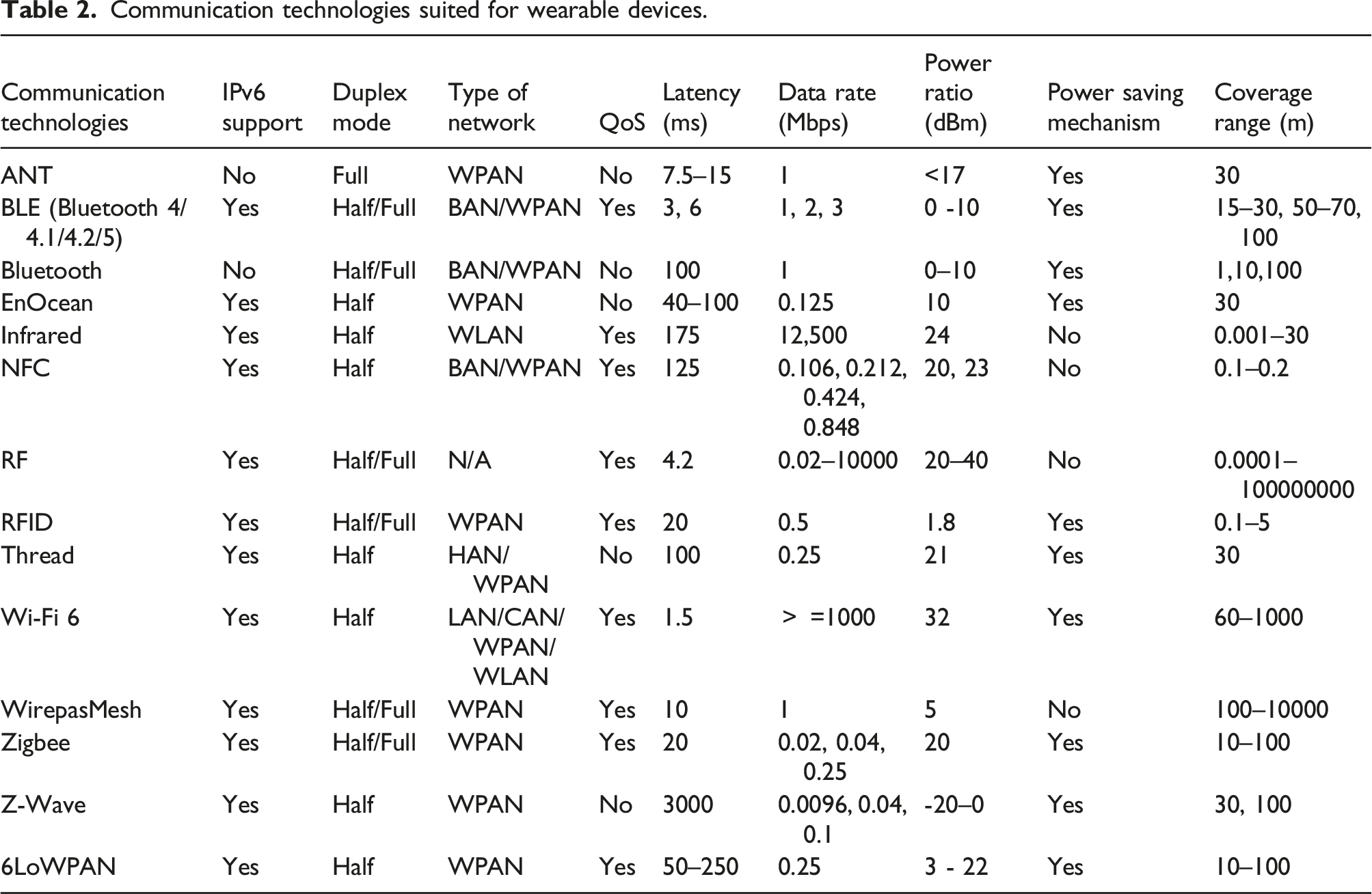 A typical communication scenario for IoT health applications can be found in a Body Area Network where EoG, ECG, and EMG sensors are attached in the form of a small chipset within wearable devices like smartwatches, wrist bands, smart shoes, clothes, or earbuds. Figure 2 shows a communication scenario for IoT health applications operating in BAN where EoG, ECG, and EMG sensors are attached in the form of a small chipset within wearable devices like smartwatches, wristbands, smart shoes, clothes, or earbuds. These gears sense, interact, and transfer data to the receiving devices through Bluetooth 5 and Wi-Fi 6. Bluetooth 5 works on 2.4GHz band with half/full-duplex mode of transmission and supports IPv6 and AES-128bit security. Moreover, through polling, it provides QoS with a minimum of 3ms latency and 3Mbps of data rate within a 100 m coverage area. Wi-Fi 6, and the integration of Wi-Fi 6 with IoT wearables, is one of the fastest-growing communication technologies because it brings kernel benefits to security, interoperability, flexibility, and improvement in data throughput. Communication scenario for IoT wearable applications.