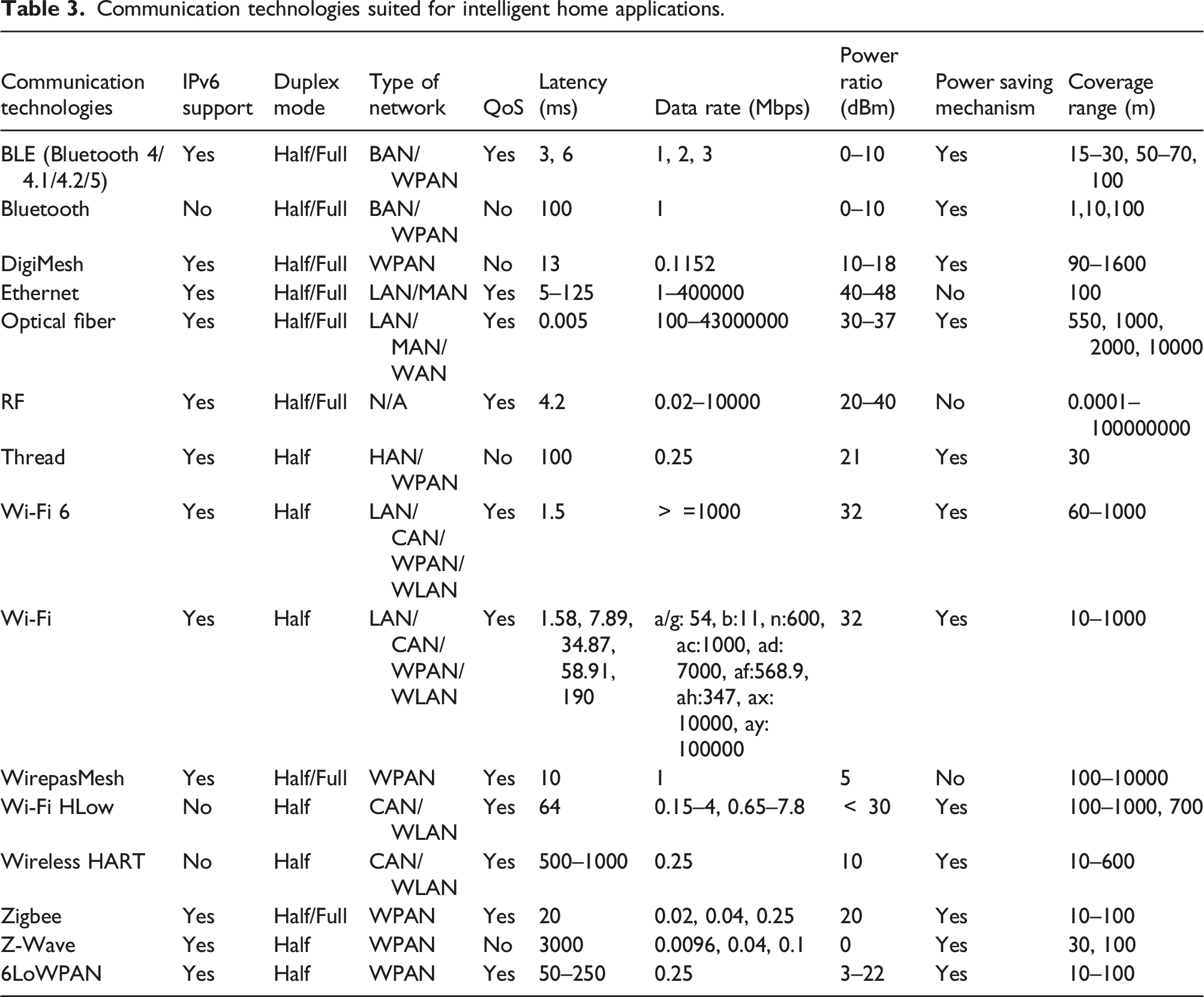 As an example of a medium-range intelligent home application, Figure 3 illustrates the communication technologies deployed in a HAN combined with the Analytics Everywhere framework to support automated analytical tasks. In intelligent homes, as in other IoT use cases, seamless connectivity is an important factor that gives users the flexibility to govern smart sensors from any location (Mao and Chang, 2023). Advanced communication tactics can minimise a smart device’s power consumption and augment its communication efficiency (Sovacool and Del Rio, 2020). Wi-Fi 6 and Wi-Fi 6E provide 1000Mbps of data rate with almost 1.5ms of negligible latency. Moreover, it uses a 6GHz band, which gives less interference compared to other technologies and provides excellent QoS with the help of mechanism like hybrid coordination function (HCF) which includes enhanced distributed channel access (for prioritised QoS services) and HCF controlled access (for parameterised QoS services). Communication scenario for intelligent home applications.