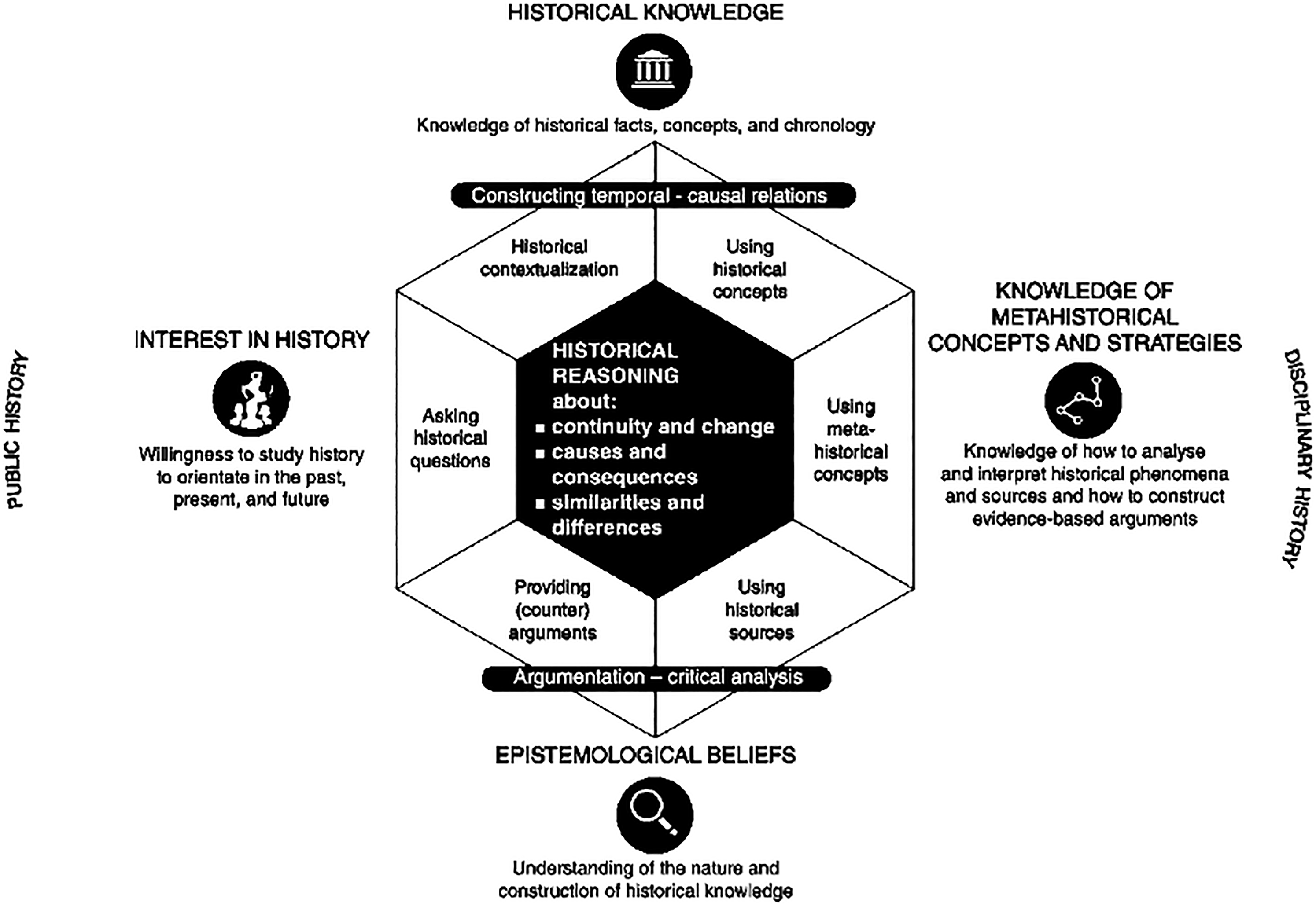 The awareness of the historicity of mathematics is part of a broader engagement with the past encapsulated within the concept of historical thinking. Despite being fairly intuitive, international research (Metzger & Harris, 2018) in the field of history education (here, in terms of school discipline) quickly encountered difficulties in definition. Based on a review of major works in the field, Lévesque and Clark (2018) proposed a potential distinction between two approaches to understanding historical consciousness. First, the historiographical approach refers to the recognition of the historicity of human beings and their knowledge in society, while the second, the educational approach, focuses on how the concept can be used for empirical research and history teaching practices (Boxtel & Drie, 2018). The authors summarize their reflections (Drie & Boxtel, 2008) through a diagram (Figure 1), which illustrates four poles: historical knowledge, interest in history, epistemological beliefs, and meta-historical knowledge.