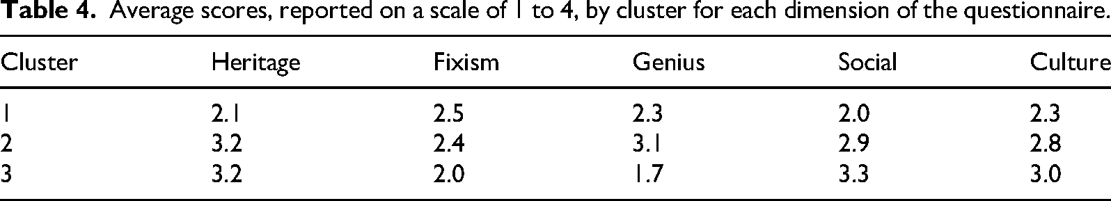 For better interpretation, the questions were grouped into the five validated dimensions of the questionnaire, namely, mathematics perceived as a form of heritage from the past (Q01, Q06), a fixist view of their evolution (Q02, Q04, Q08), the perception of the mathematician as a solitary genius (Q09, Q11), the understanding of mathematical research as a collective effort (Q10, Q12), and finally, sensitivity to the cultural dimensions of mathematics (Q05). For each of these dimensions, the average scores obtained for each cluster are provided in Table 4.