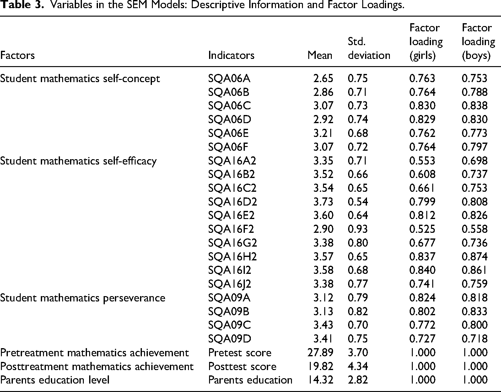 As discussed previously, the measurement model included three observed variables—parents’ education level, student pretest scores, and posttest scores—each represented by a single indicator. In contrast, mathematics self-concept, self-efficacy, and perseverance were modeled as latent constructs with multiple indicators. Descriptive statistics for all measured variables are presented in Table 3 (bivariate correlations available upon request).