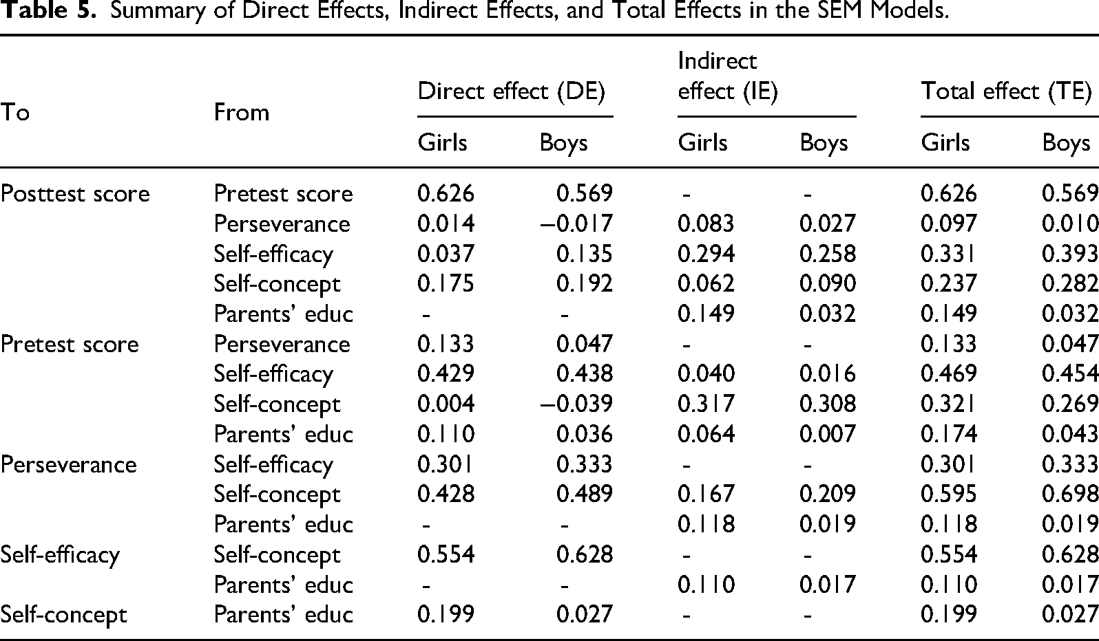 Another gender-dependent factor with a notable impact on students’ mathematical performance was parents’ education level, which was associated with girls’ pretest and posttest scores indirectly through its effects on self-concept (