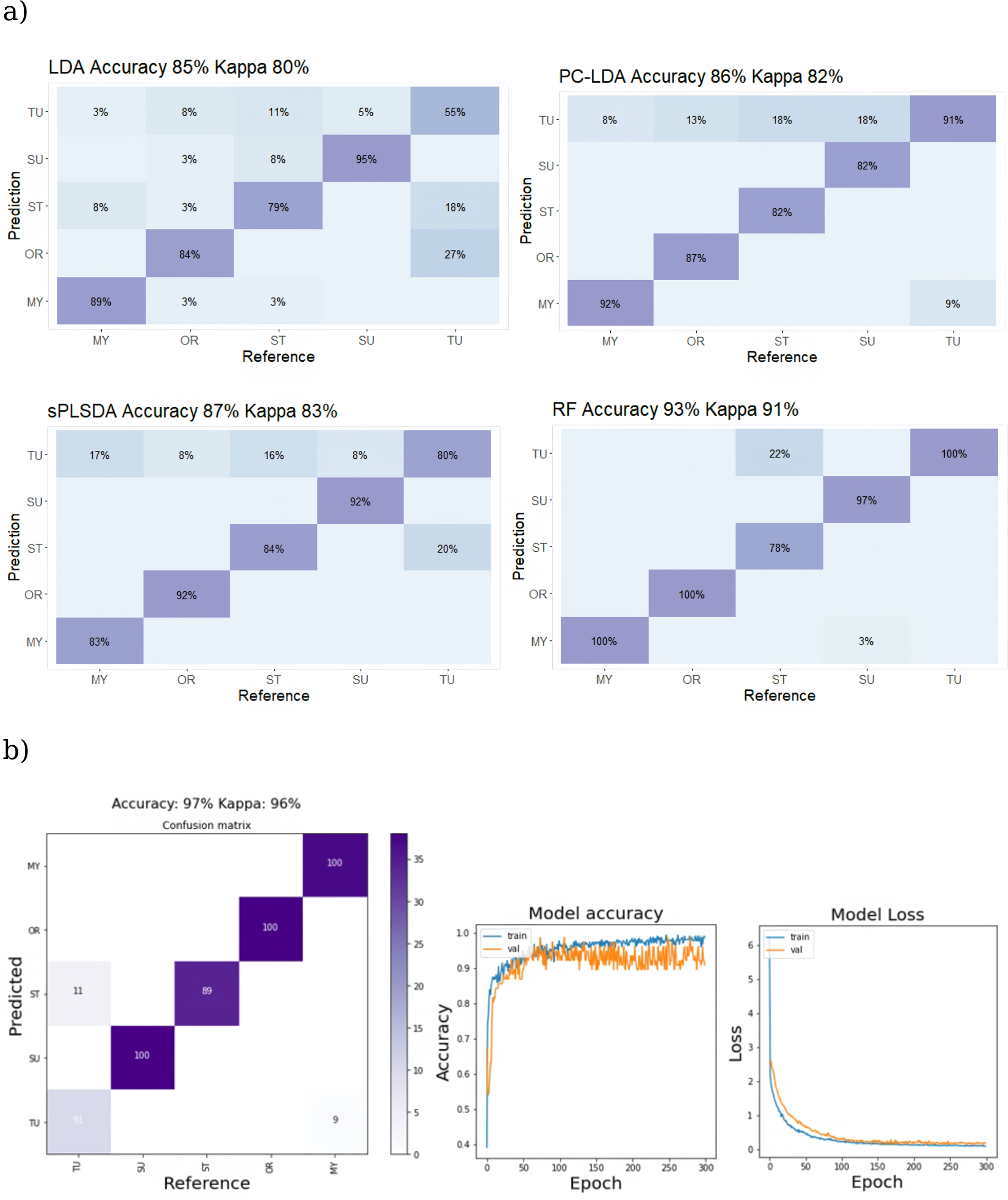 Confusion table showing classification accuracy of trained models using Raman spectral data to categorize adulterated ground TU test samples. Panel (a) shows results from shallow ML algorithms (LDA, PC–LDA, sPLS–DA, and RF), while panel (b) displays outcomes from a DL 1D CNN. The right-side plot for 1D CNN depicts model accuracy and loss versus epoch during training and validation.
