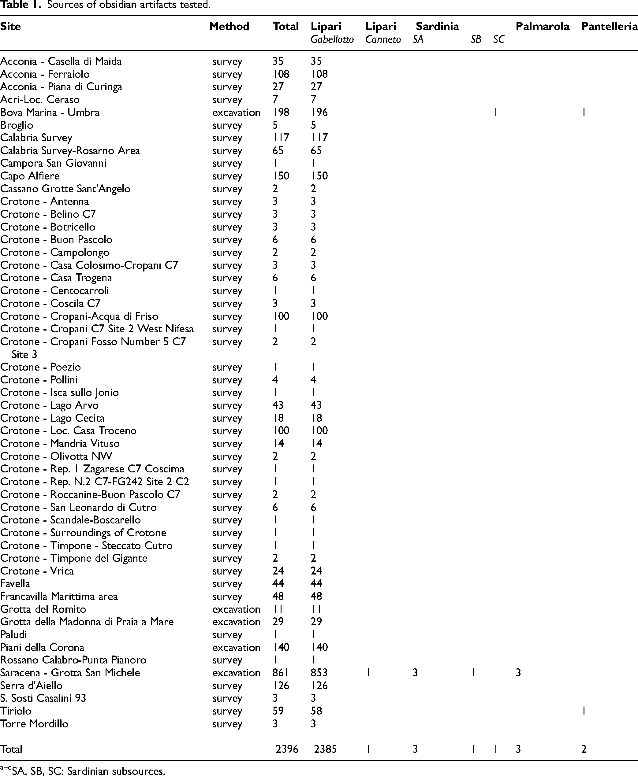 In total, 2455 artifacts from >50 sites in Calabria have been analyzed (2403 in this study; see Supplemental Material). All of the obsidian artifacts excavated or otherwise in the museum collections were analyzed. This includes 10 or more artifacts analyzed for 22 of these sites. In most cases, the entire assemblage of archaeological artifacts from the site were analyzed, avoiding a statistically limited subset. Those from the excavated sites of Bova Marina (Umbria), Grotta del Romito, Grotta della Madonna, Piani del Corona, and Saracena (Grotta San Michele) have specific cultural and temporal associations, as shown in the list below, while many of the sites were surveys (Table I).
