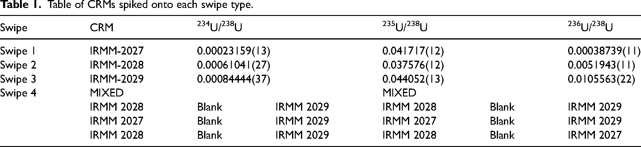 High-precision uranium isotopic analyses of the CRM samples were performed on a Thermo Scientific Neptune Plus (Germany) double-focusing, multi-collector ICP-MS (MC-ICP-MS) instrument. This MC-ICP-MS instrument is equipped with 10 Faraday cups, three secondary electron multipliers, and two compact discrete dynodes and was used to analyze 234U/238U, 235U/238U, and 236U/238U isotopic ratios. The instrument is outfitted with an Apex Omega high-efficiency introduction system (Elemental Scientific Inc., USA), using a nickel jet sample cone and a nickel X skimmer cone. The uranium analyses were made using an amplifier with a 1011 Ω resistor on 238U, and the 234U, 235U, and 236U isotopes were measured using secondary electron multipliers. Throughout the analytical session, isotopic reference materials were analyzed, bracketing samples to correct for instrumental mass bias (IRMM-2025) and as quality controls (IRMM-2020 and IRMM-2022). Instrumental mass bias effects on samples and standards were corrected by direct comparison against IRMM-2025. Corrections were also made for instrumental blank and hydride contributions.
