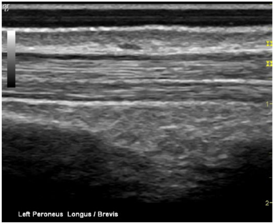 Long-axis sonogram showing the normal, asymptomatic left peroneus longus and peroneus brevis tendons.