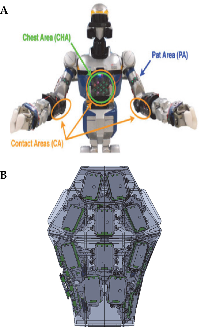In reality, torso tactile sensing is also likely applicable to the hands, arms, legs, and other parts of the body. Argall et al. [51] summarized the applications of robotic torso tactile sensing in early human–robot interaction systems. In recent years, research on torso tactile sensing has attracted much attention with the continuous development of the large‐scale electronic skin technology. Metta et al. [52] used a capacitive tactile sensing unit to cover the torso of an iCub robot for cognitive ability research. Harada et al. [53] equipped a fingerprint‐like three‐axis tactile force sensor on a robot's body for tactile and slip detection. Mittendorfer et al. [49] imitated the human skin and developed a multi‐modal tactile sensor array, called CellulARSkin, to detect information such as proximity, vibration, temperature, and pressure. A tactile demonstration guides the movement of the entire body to grasp unknown objects. Kaboli et al. [54] further applied CellulARSkin to the torso of a small humanoid robot, NAO. Büscher et al. [55] designed a flexible, stretchable tactile sensor that can seamlessly cover a robot's body for daily human–robot interactions. Ku et al. [50] equipped a humanoid robot with a distributed tactile sensing array to identify 18 social touch patterns (e.g., hit, tap, and pat). Our research team recently installed a tactile array on the back of a service robot to recognize the tactile emotion during the human–robot interaction [56].