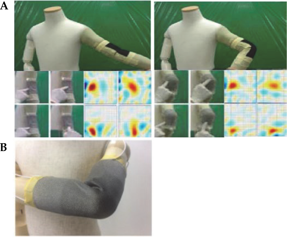 In Ref. [68, 69], rubber materials were used as electrical conductors and EIT was implemented to reconstruct the resistivity distribution. The stretchable electronic skin was designed in Ref. [70, 71], which can adapt to the elbow of a robot with 19 electrodes and was designed into a thin, flexible, and stretchable artificial skin that can be applied on the fore arm and upper arm of the robot to obtain information (e.g., contact position, contact duration, and contact intensity). Furthermore, Pugach et al. [72] and Park et al. [73] used neural networks to implement image reconstruction. Fig. 8 shows some representative work on tactile sensing based on EIT.