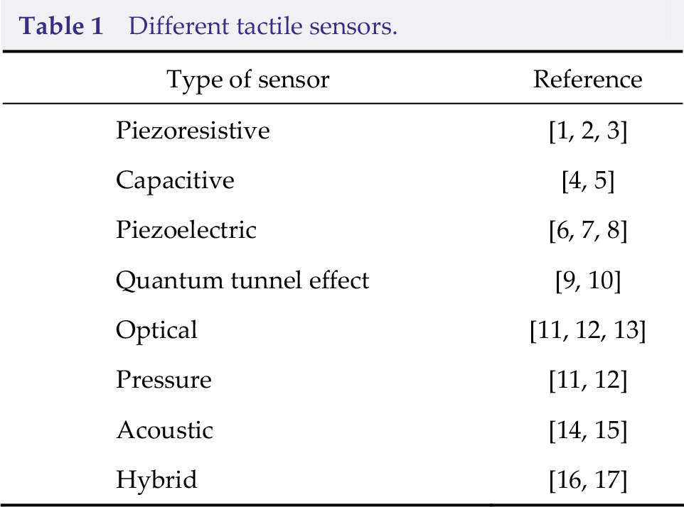 Tactile sensing is the prerequisite of physical interaction and embodied learning among a robot, the environment, and a human. It plays a significant role in many tasks, such as environment detection, dexterous manipulation, and human–robot interaction, as well as in fields such as electronic engineering, instrument measurement, and materials. Tactile sensors are categorized into various types according to their physical principles (Table 1).