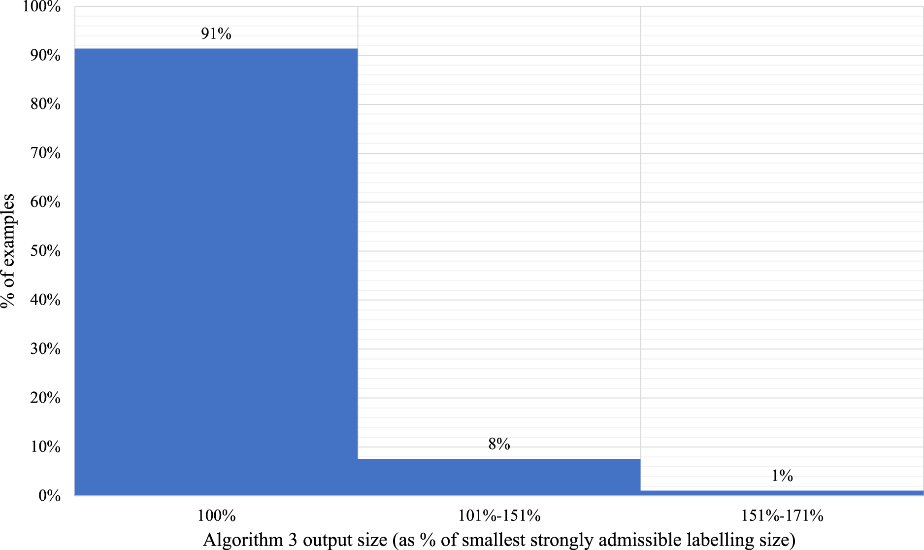 We found that in 91% of the 277 examples, the output of Algorithm 3 is of the same size as the smallest strongly admissible labelling for the output of the main argument. For the other 9% of the examples, the output of Algorithm 3 has a bigger size. On average, we found that the output of Algorithm 3 is 3% bigger than the smallest strongly admissible labelling for the main argument. Figure 6, provides a more detailed overview of how much bigger the output of Algorithm 3 is compared to the smallest strongly admissible labelling for the main argument.