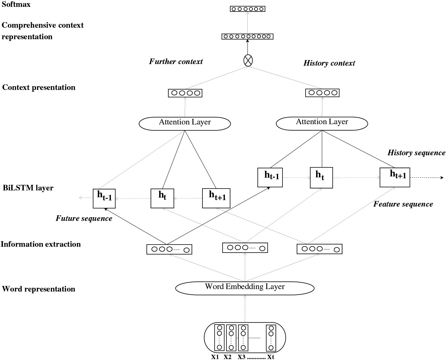 The attention mechanism (AM) for the single word representation evokes more interest in the terms that contribute to the meaning of the context and can help to clarify the semantic of sentences. In A-BiLSTM, two attention layers process the previous and successive contextual characteristics, respectively. These characteristics are concatenated together in AM and served into the classifier softmax. The A-BiLSTM model architecture is shown in Fig. 3.
