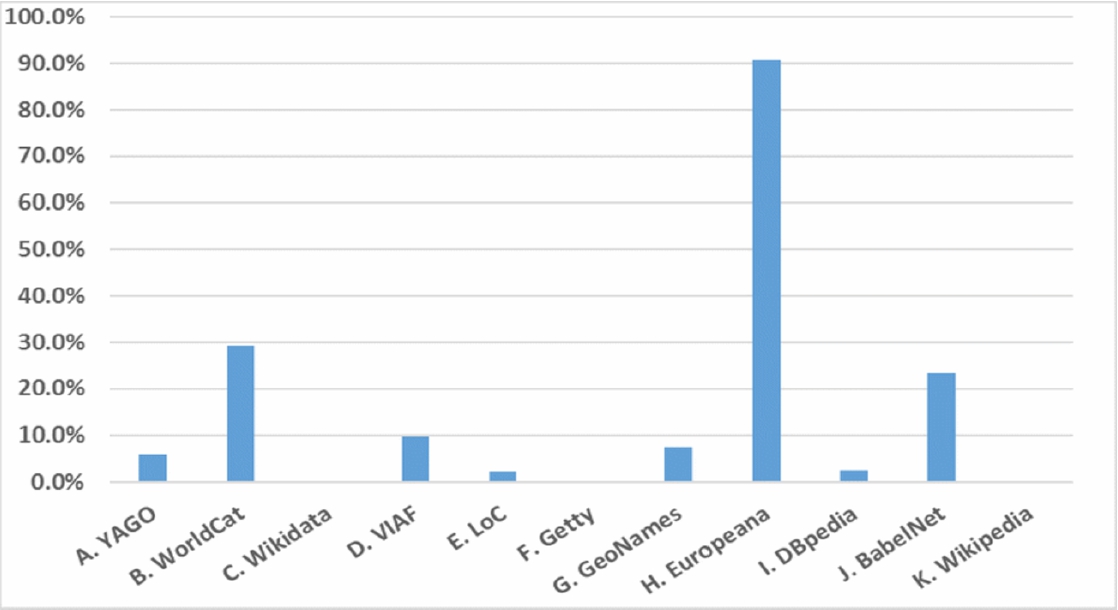 Figure 11 illustrates how close the 11 data sources are connected to each other through four standardised properly links. It displays the ratio of the hyperlinks bounding for the domains of the 11 datasets. Thus, it should represent the openness or closure of this small network. A high level of exclusivity for our data sources is observed. On average, 87.8% of links are within the 11 dataset boundary. Except Wikipedia, VIAF remains the lowest source in terms of links to the other datasets, but still holds over 37.3%. The statistics clearly indicate the closed and close connections of the 11 data sources in terms of standardised traversability.