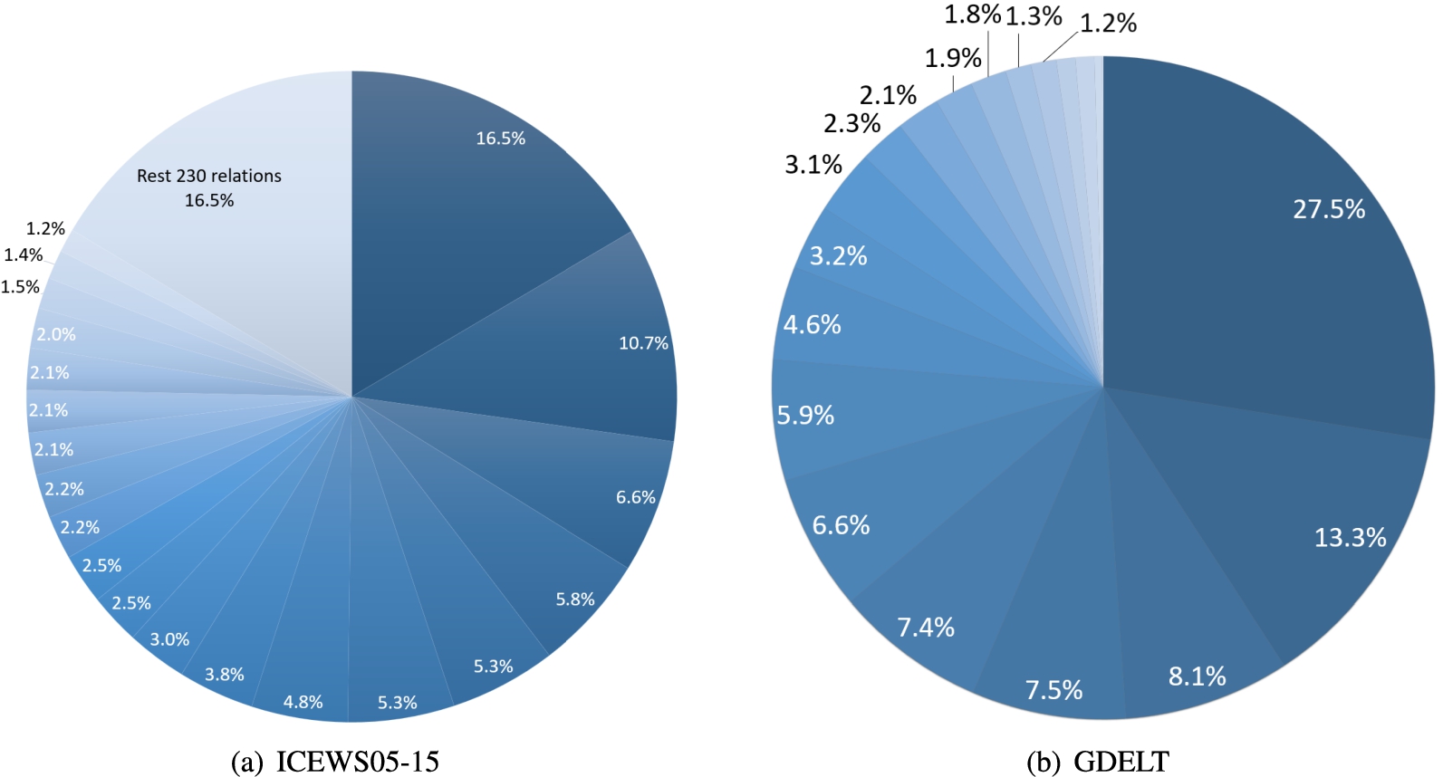 ICEWS14 and ICEWS05-15 have higher number of entities, relation types, and timestamps than GDELT which are shown in Table 2. While the GDELT dataset has only 20 relations, it is way denser than the other two datasets and have much larger data volume in terms of facts. We show the number of quadruples for different relations in Fig. 2, and we also give the information about the number of quadruples formed by each relation in Table 5. As the statistics of the two datasets ICEWS14 and ICEWS05-15 are similar, we only show the case of ICEWS05-15. It is noting that in both ICEWS14 and ICEWS05-15, the top 10 relations in terms of quantity almost construct the 60% of the datasets. In ICEWS05-15, there are 212 relations, among which each relation is present in less than 1000 facts. Only 39 relations out of 212 is present in more than 1000 facts, which leads to less density, resulting in a weak expression ability of most relations. At the same time, this dataset has more than 4000 timestamps that makes the temporal information more relevant. Different from the ICEWS05-15 dataset, in GDELT, there are 10 relations that each of them built more than 100 thousand facts, and 9 relations that each of them built more than 10 thousand facts, so all relations are relatively fully used in different facts. Such a small number of relations and timestamps contribute to a large amount of data, indicating that both relations and time have rich semantics in this dataset.