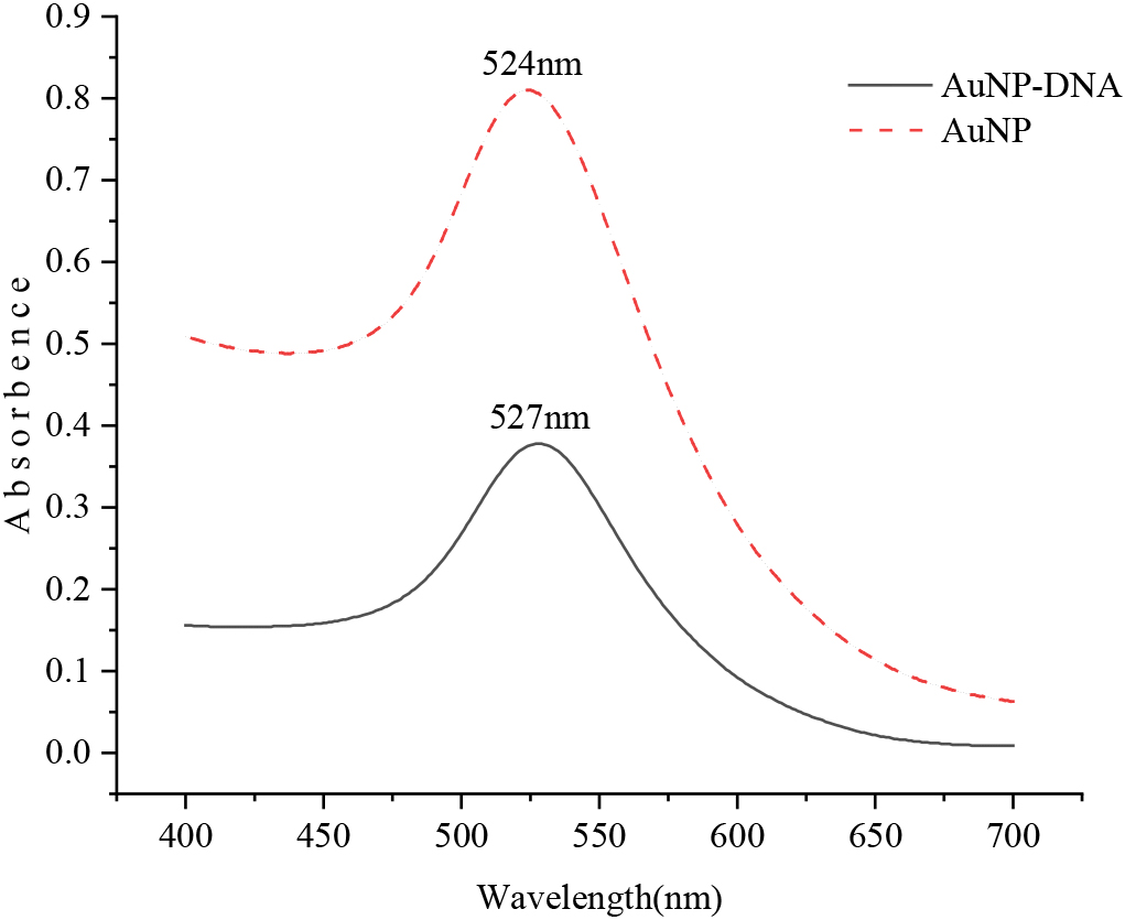 The AuNPs solution before and after the reaction was scanned by UV-visible spectrophotometer with a wavelength range of 400–700 nm, as shown in Fig. 3. The highest absorption peak of the AuNPs solution was at 524 nm, and the highest absorption peak of the nanometer particle solution combined with the identification probe was at 527 nm. The absorbance value ranged from 0.810 to 0.378, indicating that the nanoparticles were successfully labeled with the recognition probe. At the same time, it was found that the nanoparticles would accumulate and sink in DNA-free gold nanoparticles solution when the precipitate was dissolved in PBS buffer by centrifugation, and the color of the solution would also change significantly. Nanoparticles modified with DNA, however, do not converge and sink, and the color of the solution is basically unchanged. This phenomenon also suggests that the nanoparticles have modified DNA successfully.