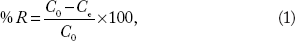 Percent removal and amount of Cd(II) ions adsorbed at equilibrium were calculated using the following Equations 1 and 2, respectively:
