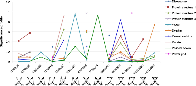 Besides the common significant motifs, each network has its own set of motifs that are unique to that network. The reason could be that these motifs play a role in characterizing the unique structure of individual networks. Supplementary Table 6 shows some insignificant motifs specific to each undirected network. For example, motif ID 213597653354134 was found only in protein structure 1, and motif ID 72649290795 is exclusive to the dolphin social network.