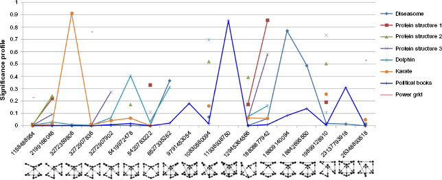 Figures 4 7 show the patterns of all significant motifs for each motif size from five to eight nodes in undirected networks. As the motif size increases, the patterns become more unclear. It is apparent from these graphs that, once the motif size exceeds four nodes, the graphs lose the pattern that exists with smaller motifs that have three or four nodes. This could mean that many of the undirected networks are similar at the basic three- and four-node motifs level structure but not at the higher level structure, which includes motifs with five or more nodes. This suggests that the dissimilarity increases between these networks as the motif size increases.